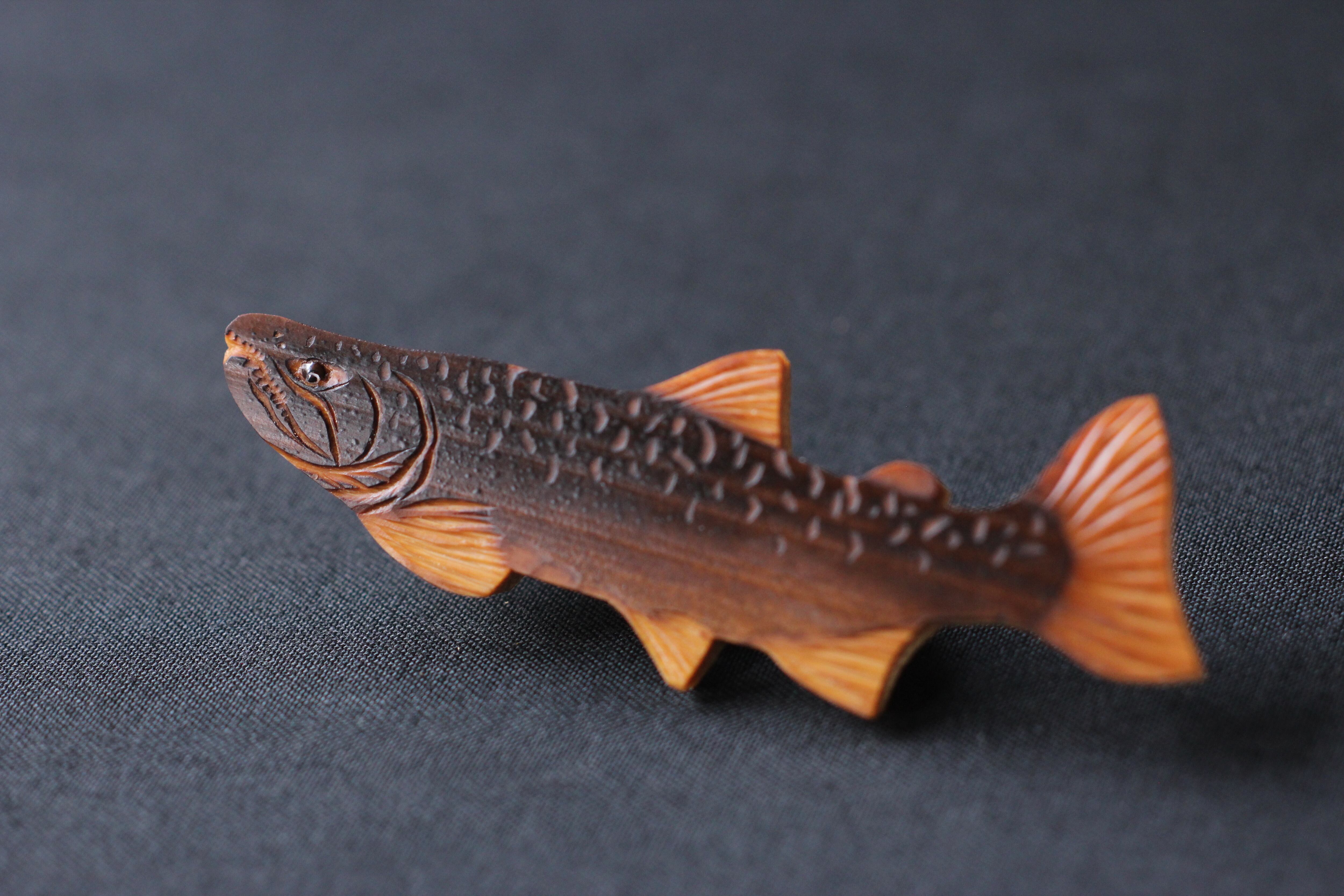 竹の表面の模様を活かすとともに焼き入れを施し、顔や鰭などを彫刻してリアルさをプラス。