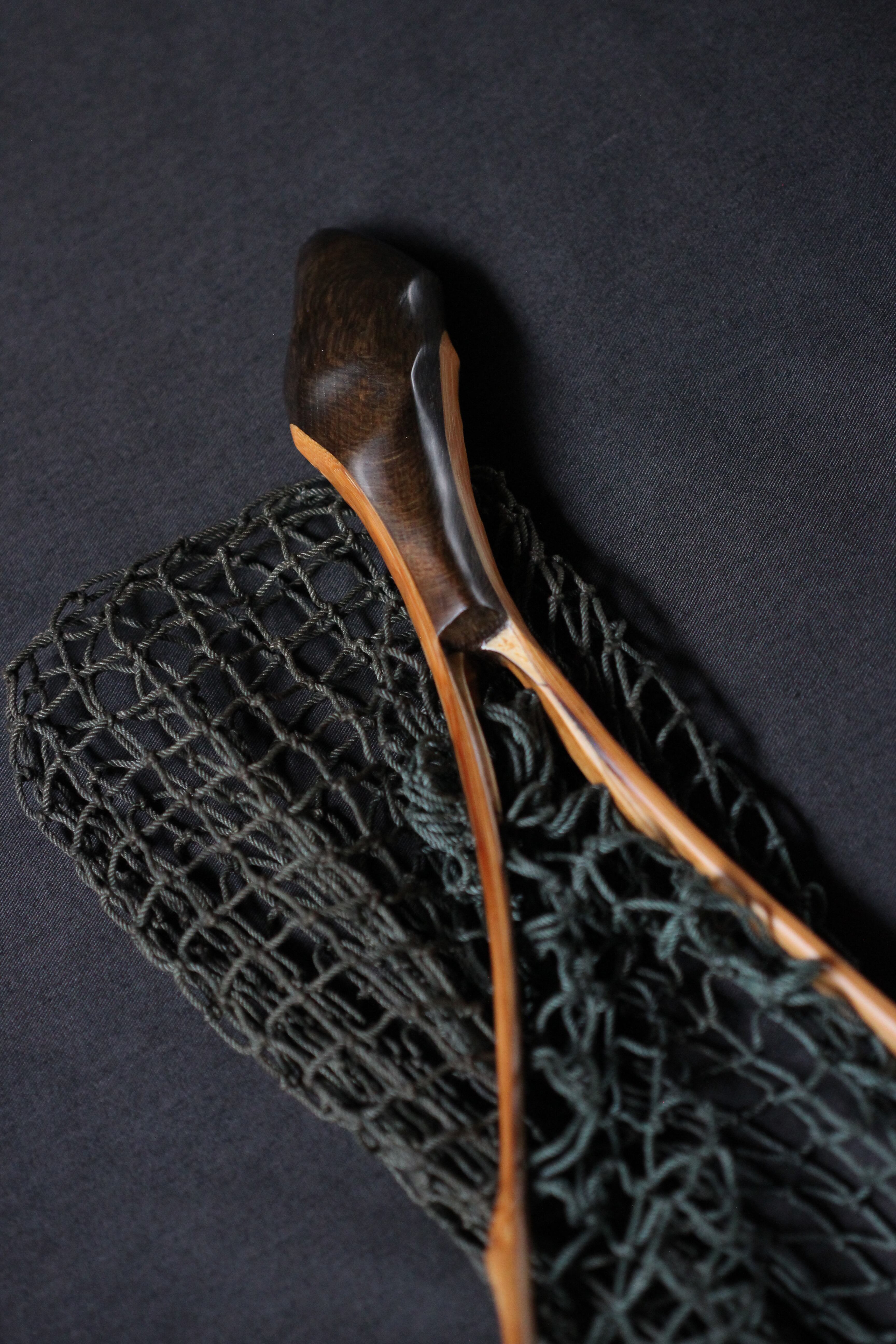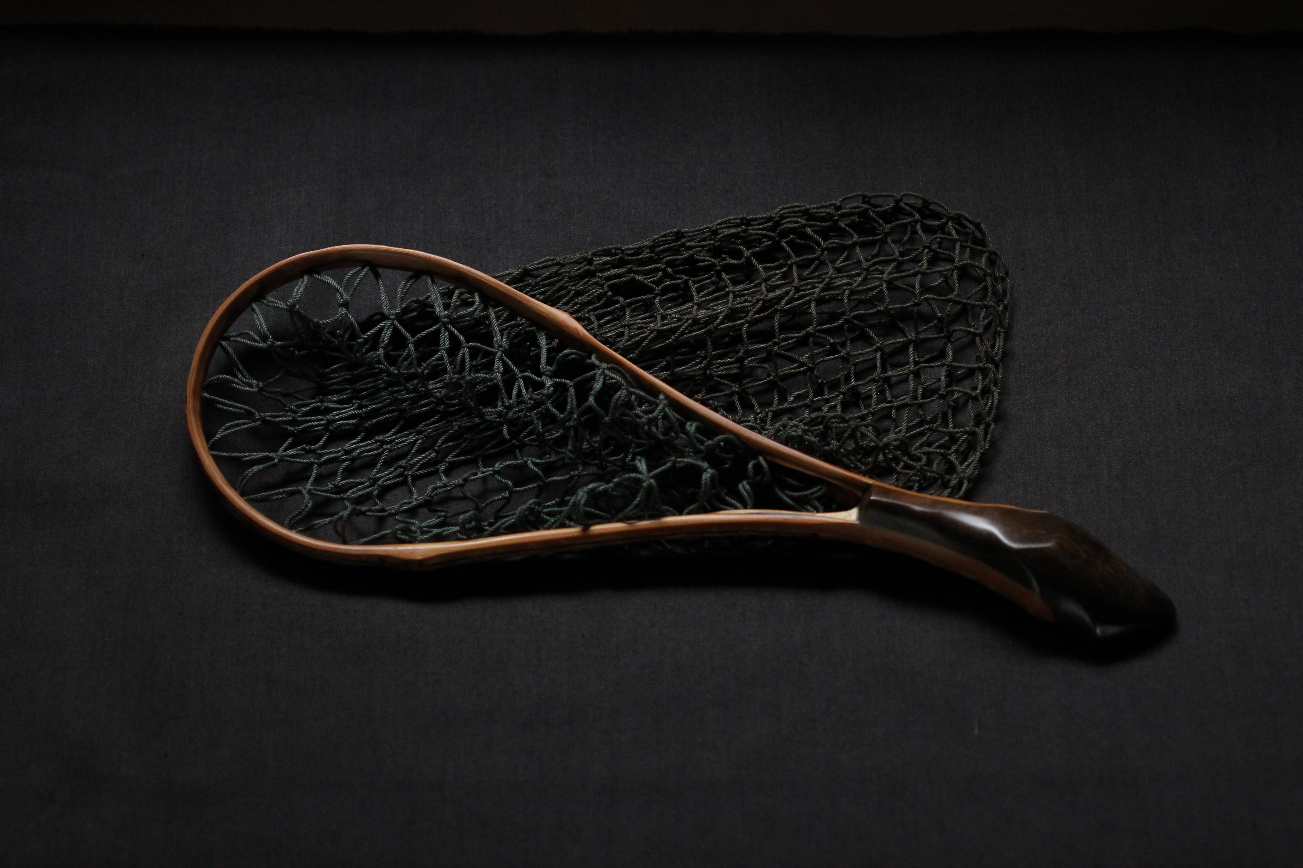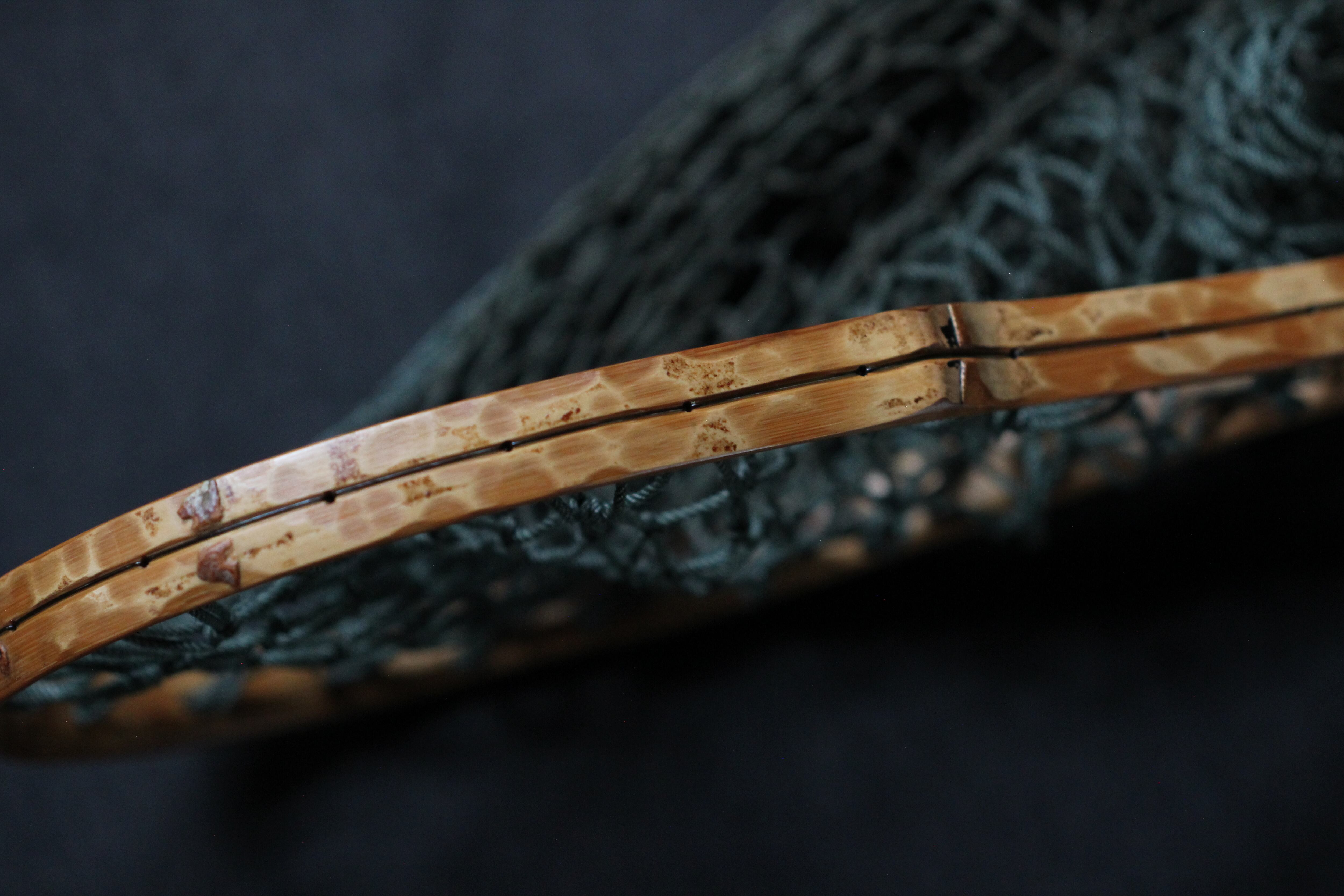 那珂川流域の流木をグリップに使用し、フレームを真竹で仕上げたランディングネット【流渦:RYUZU】。