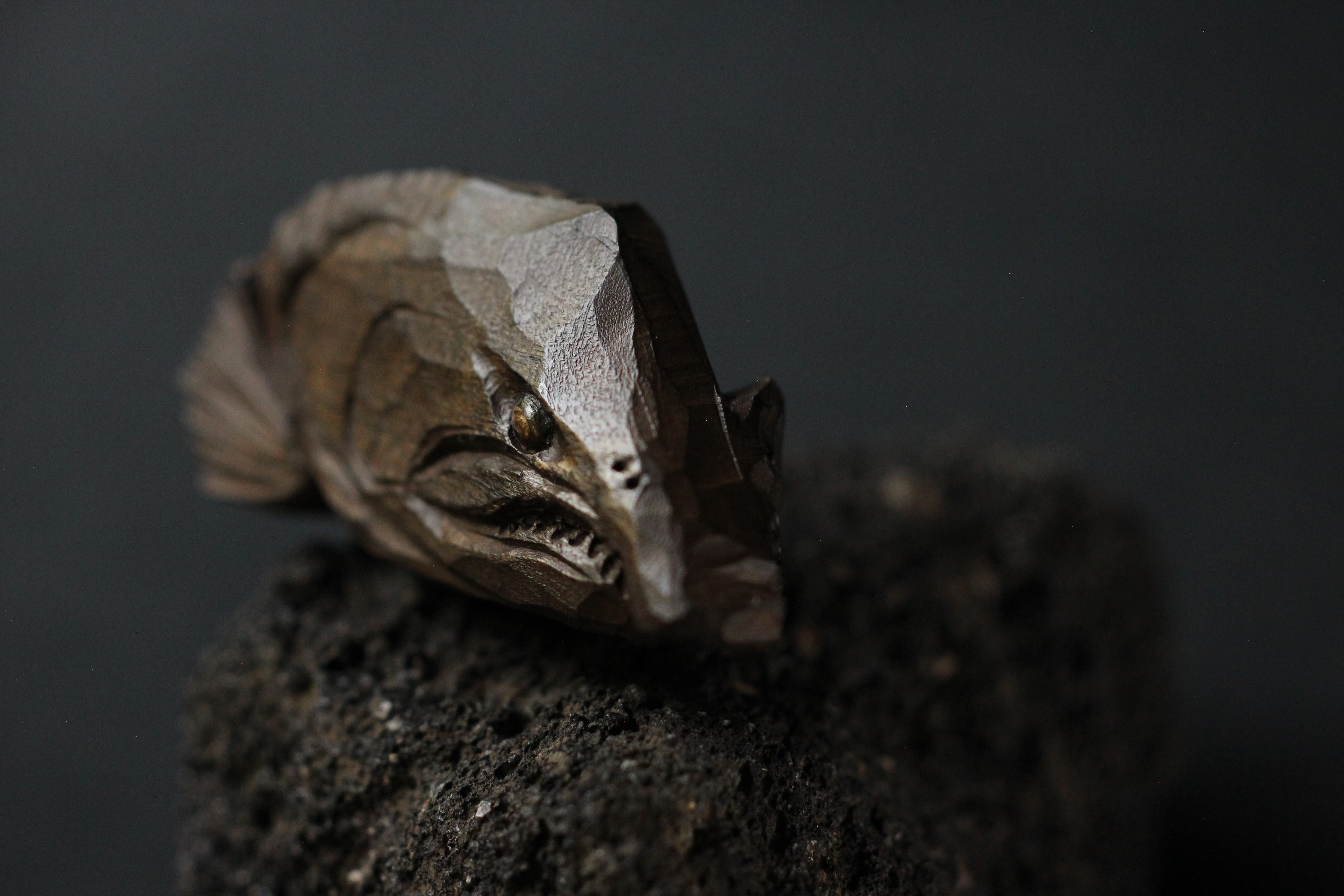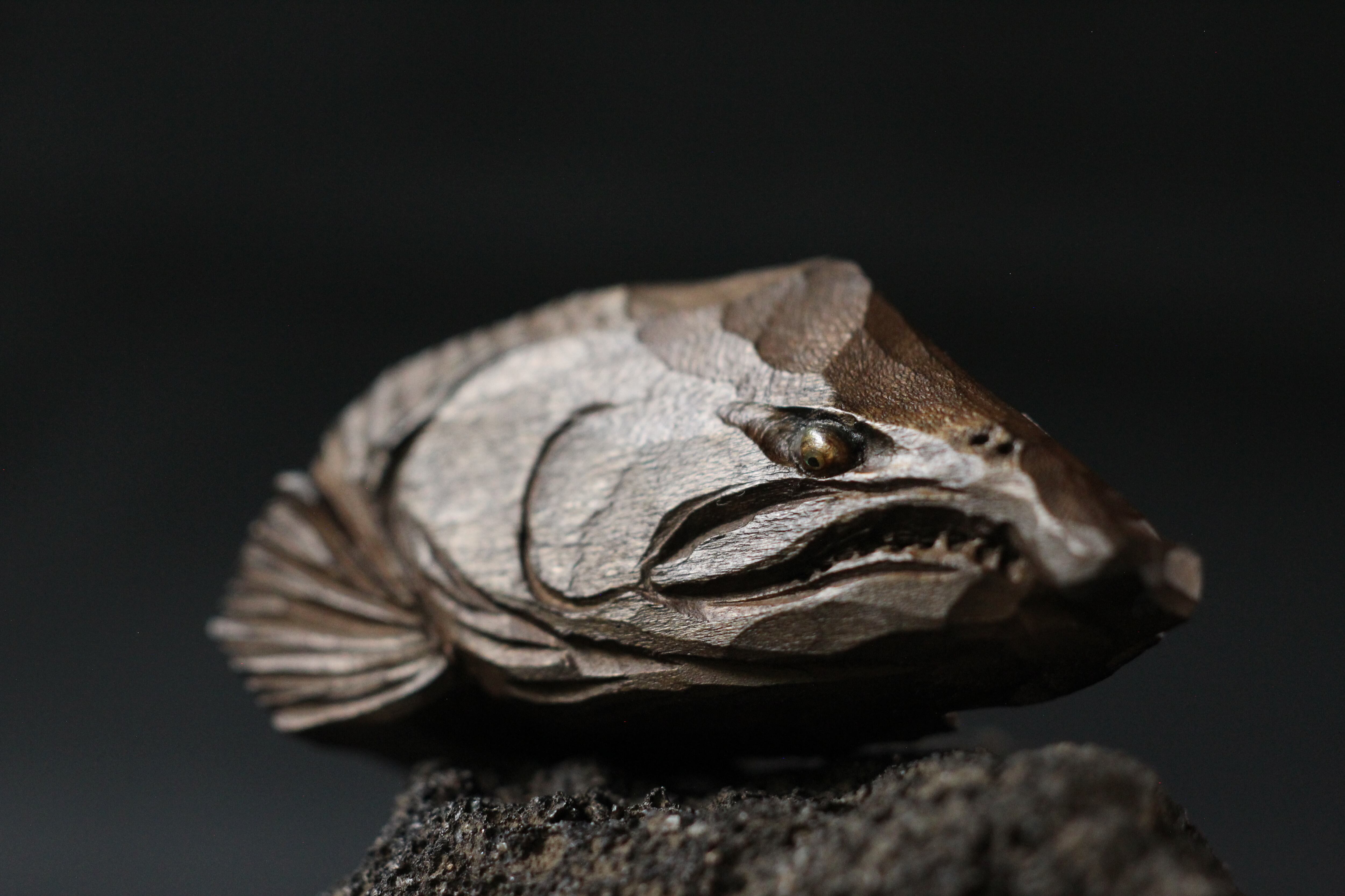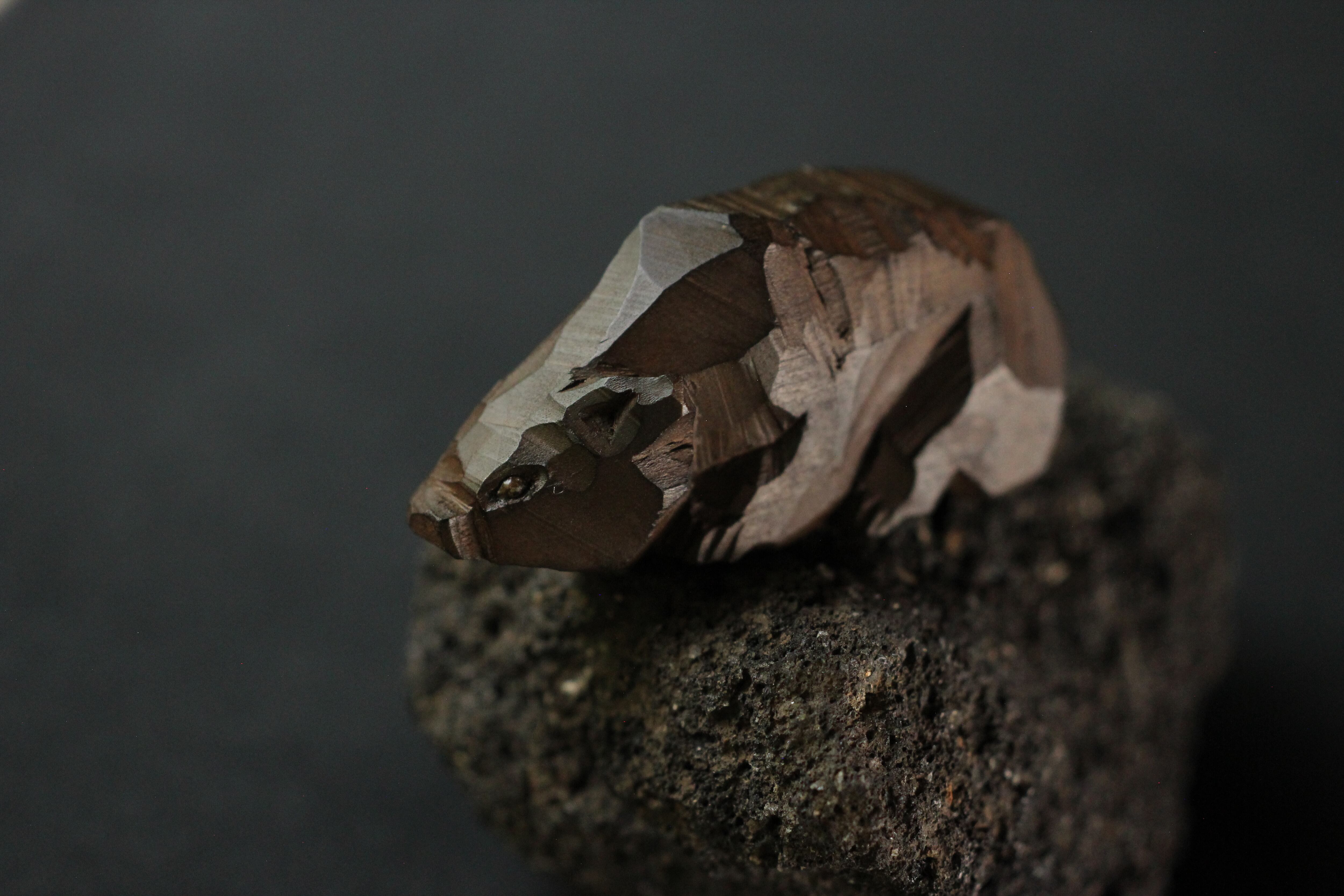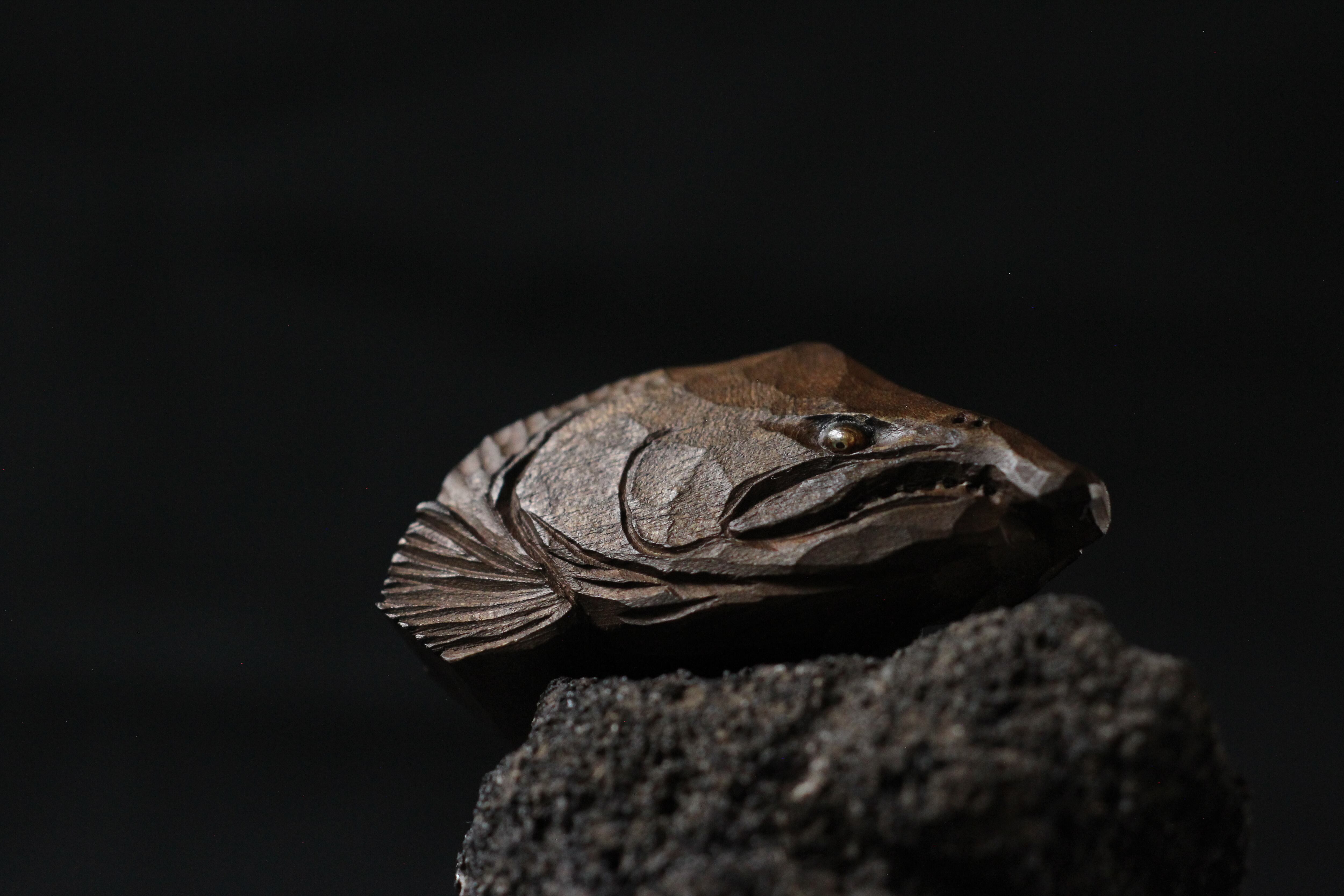 那珂川流域材から彫りだした熊と鱒の小さなオブジェクト。