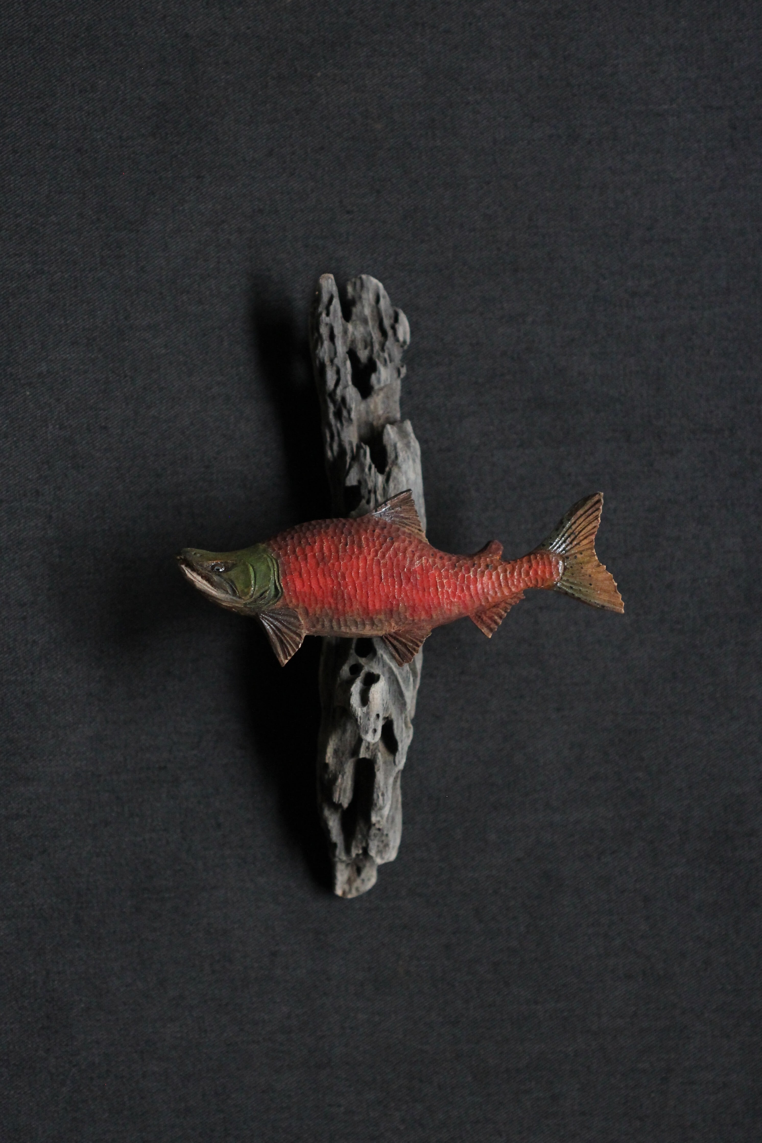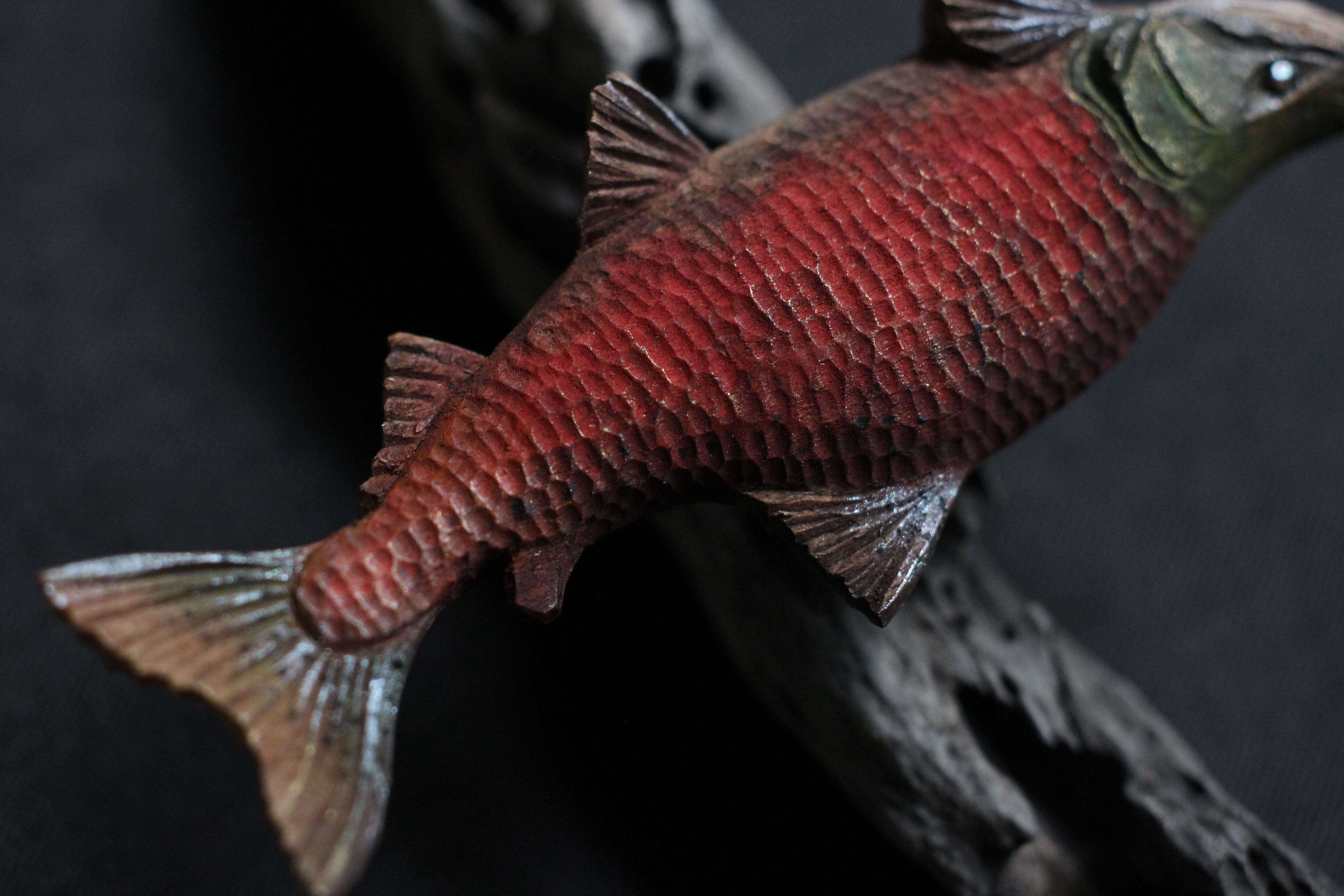 小さな壁掛けですが、姫鱒の赤が際立つように流域の流木に据え、より詳細な彫りにこだわりました。