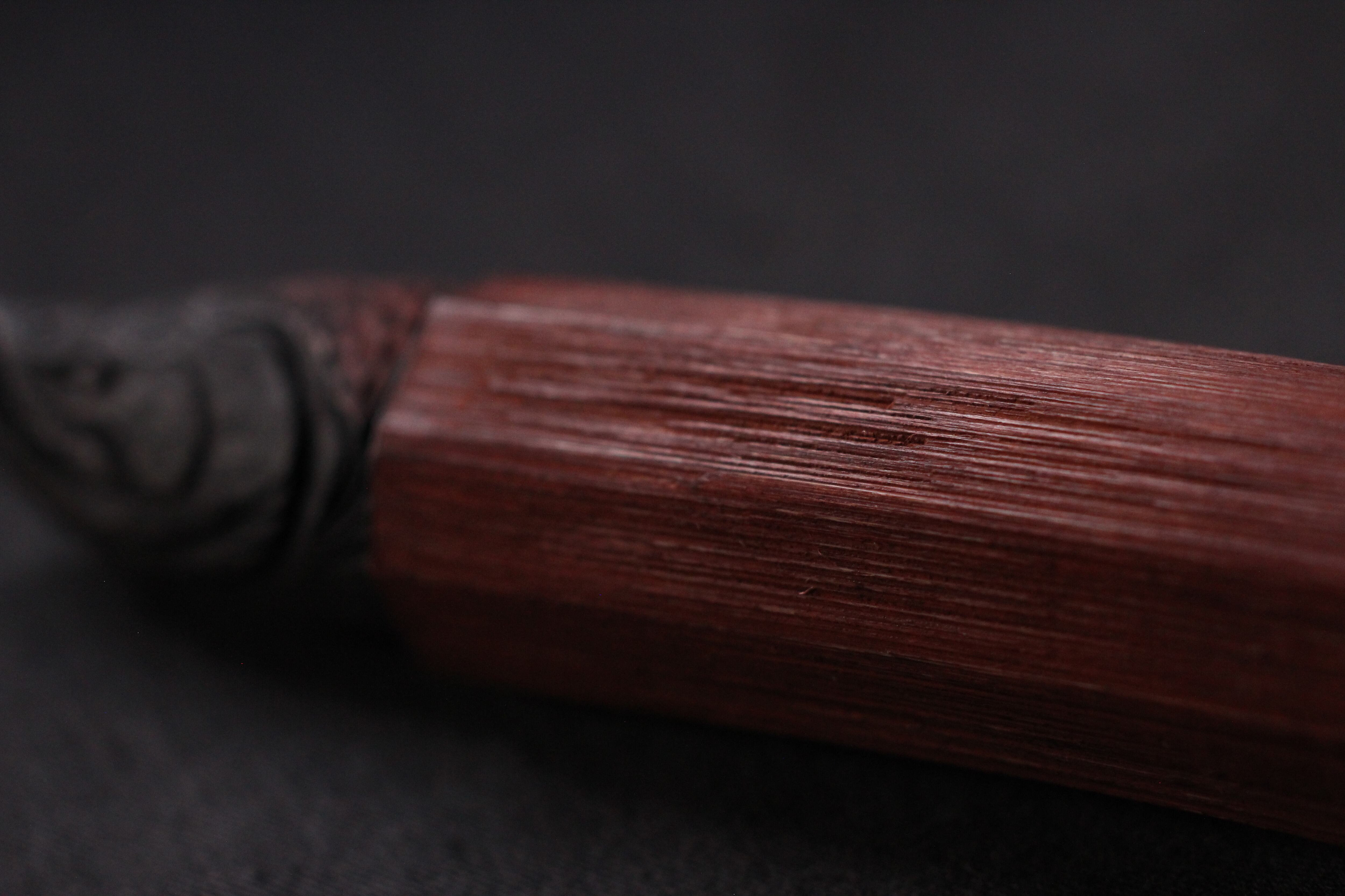 秋鱒の彫刻を施した栓に流域ベンガラで着色した竹筒をあわせた大変渋い一味入れです。