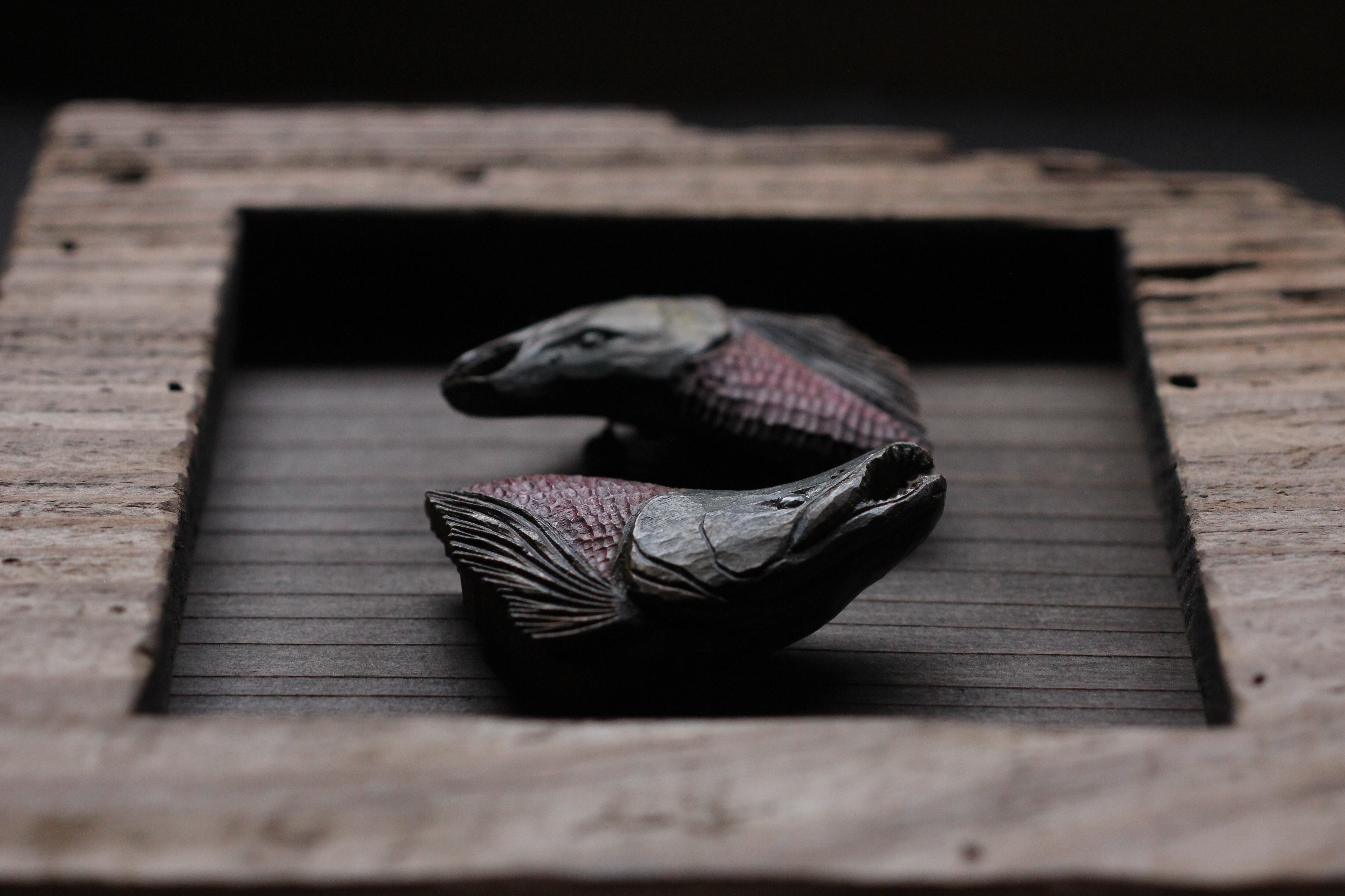 那珂川流域のヤマザクラから彫りだした姫鱒のオブジェ、ブローチです。