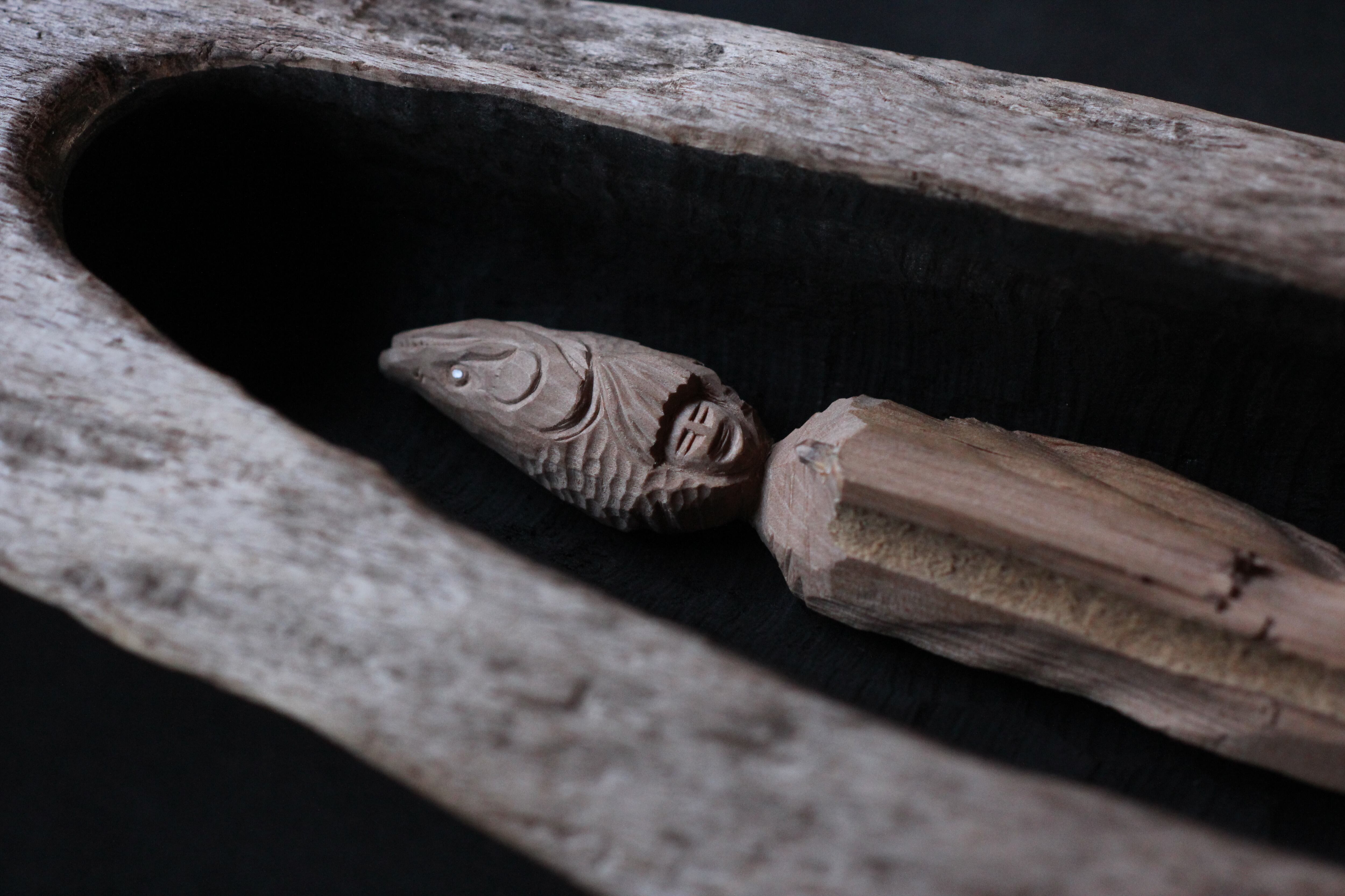 那珂川流域の椿の割り面の自然造形を活かして彫りだした善女鱒玉立像(鱒仏)です。