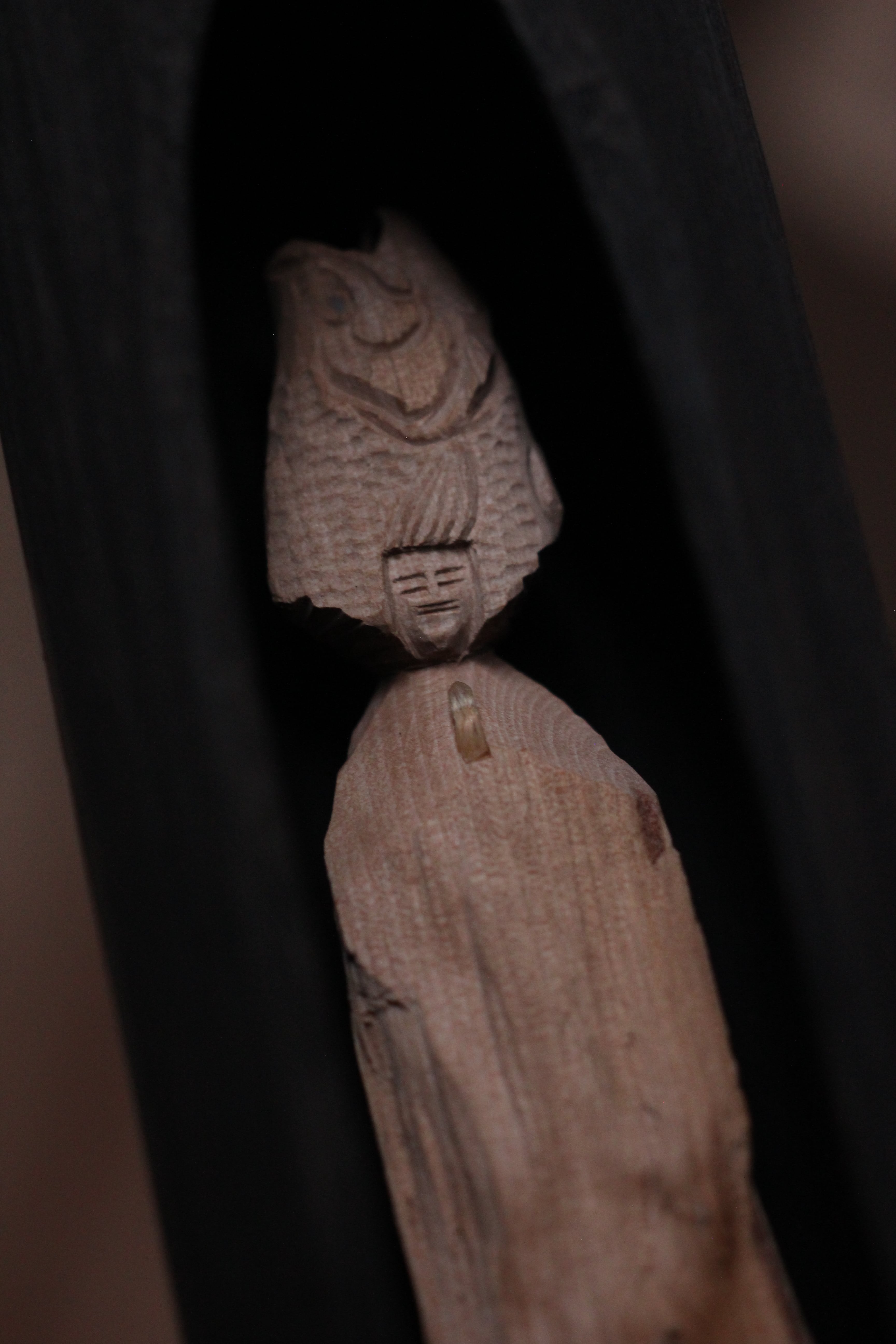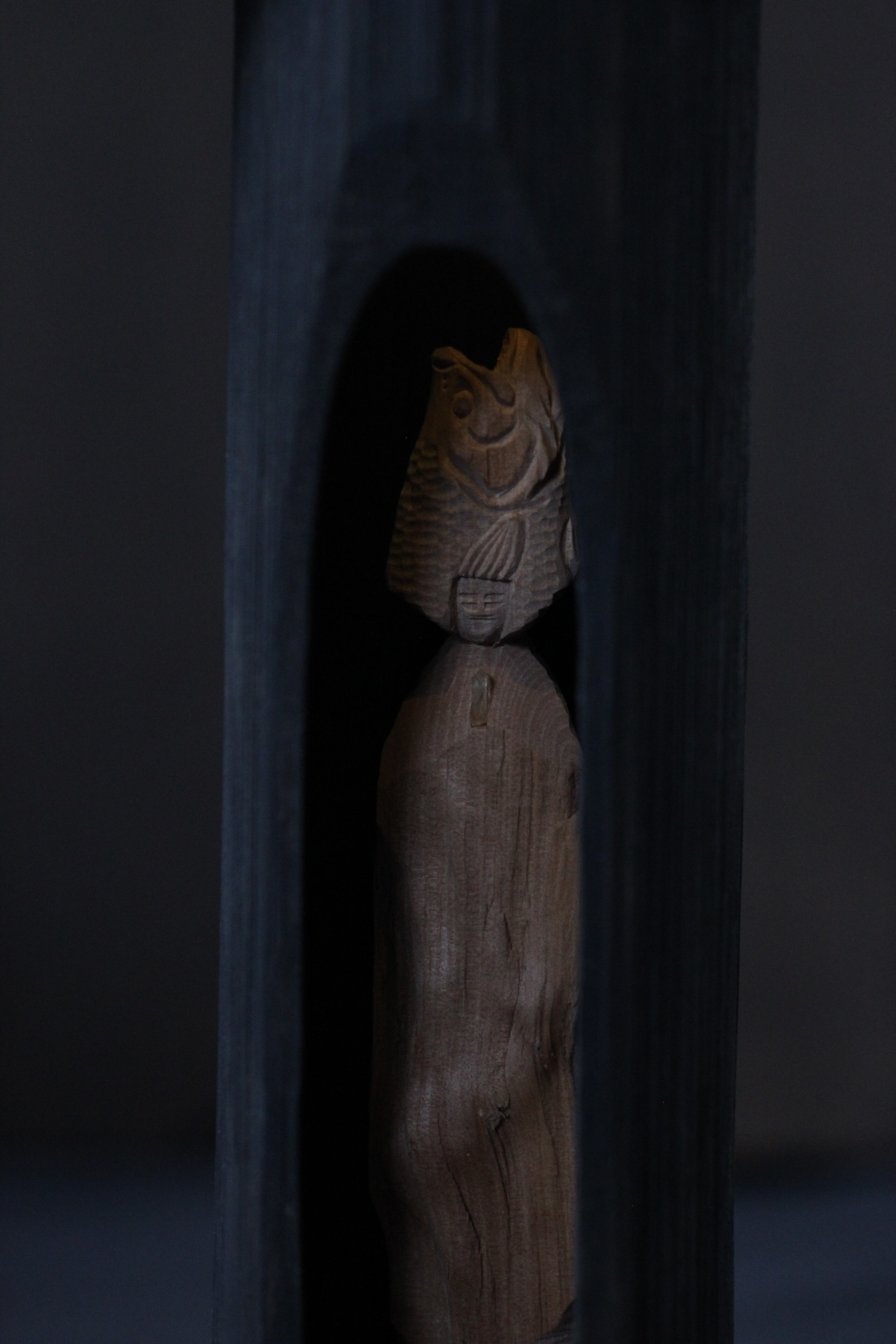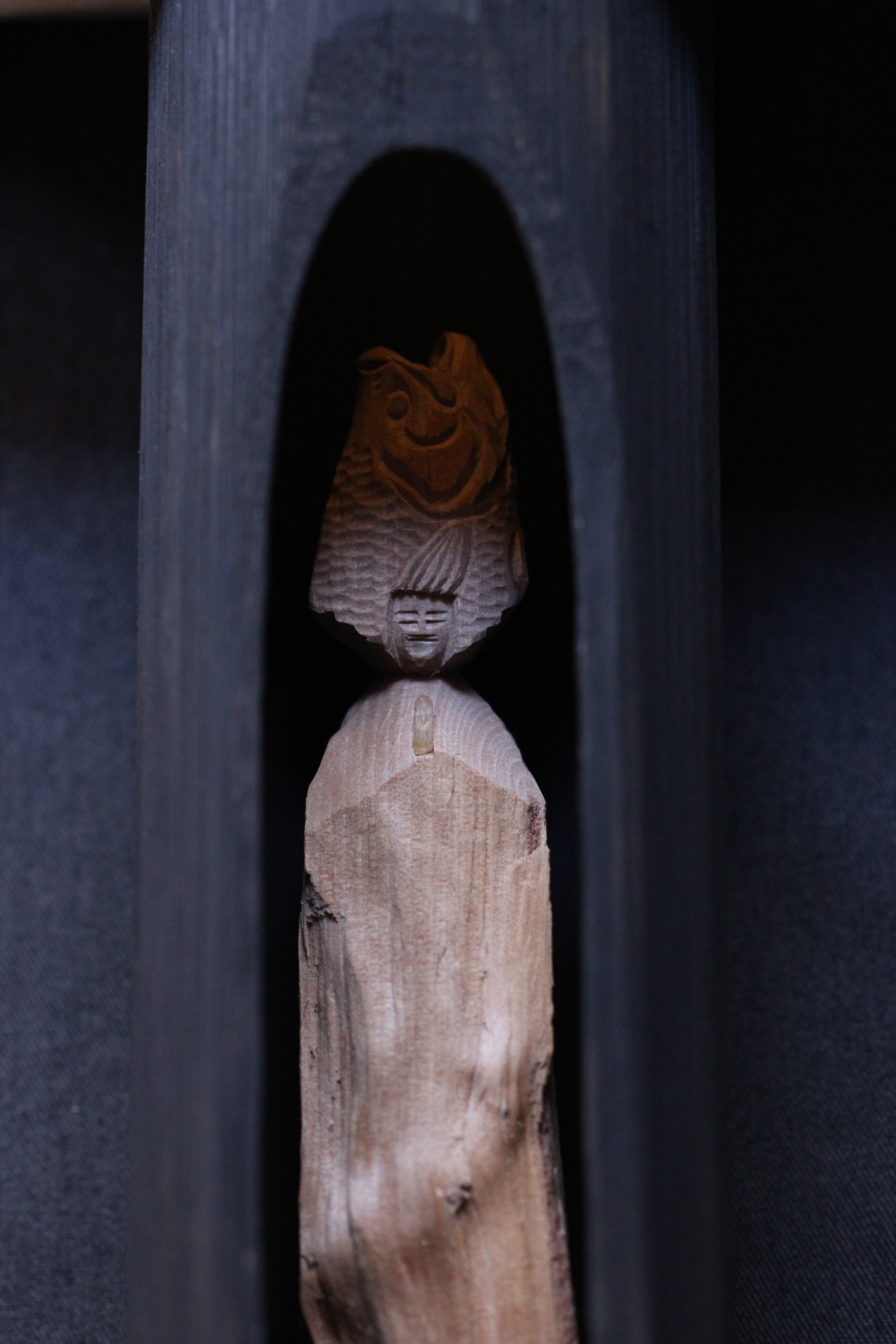 那珂川流域の椿の割り面の自然造形を活かして彫りだした善女虎鱸玉立像(虎鱸仏:ばすぶつ)です。スモールマウスブツともいいます。