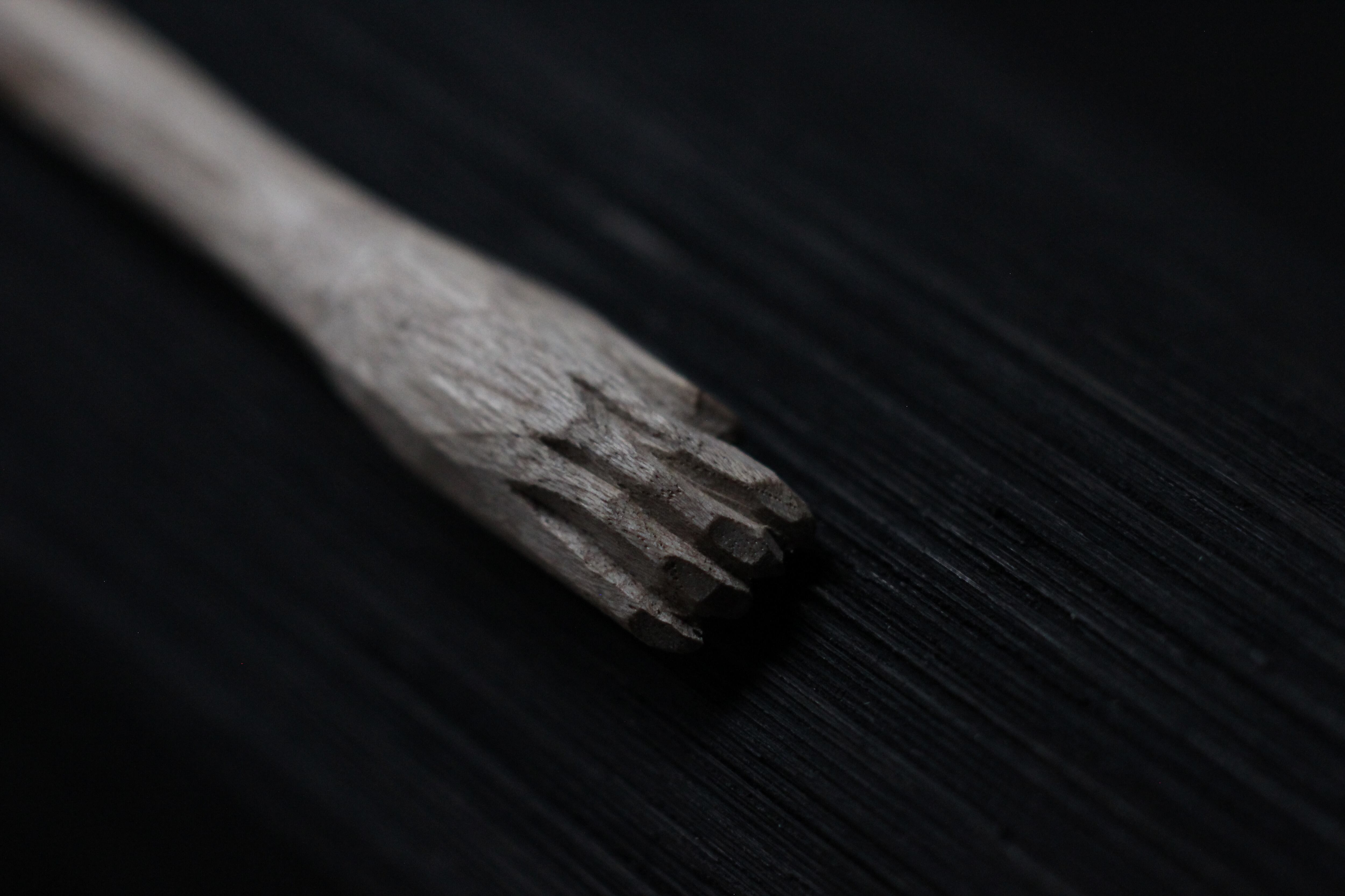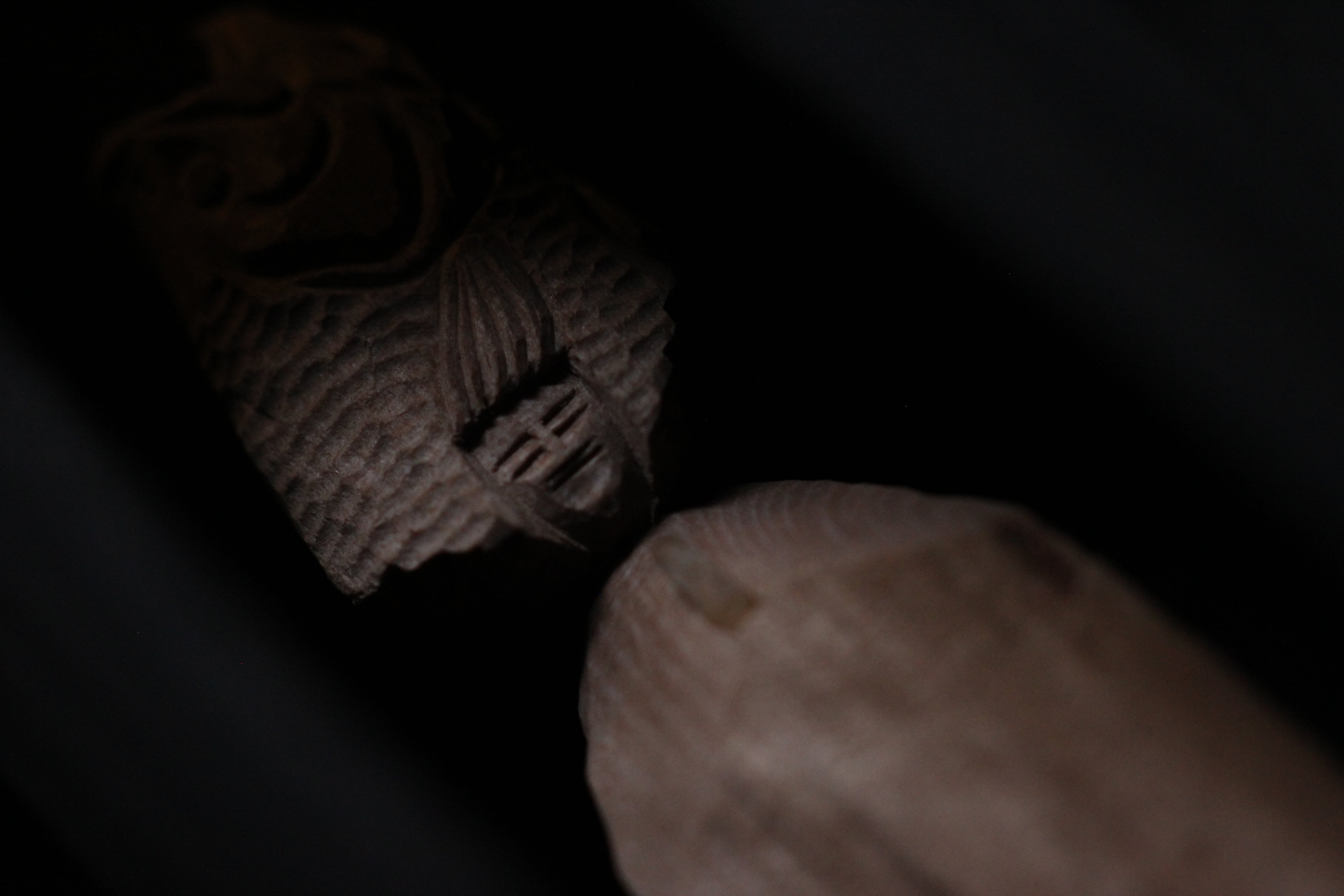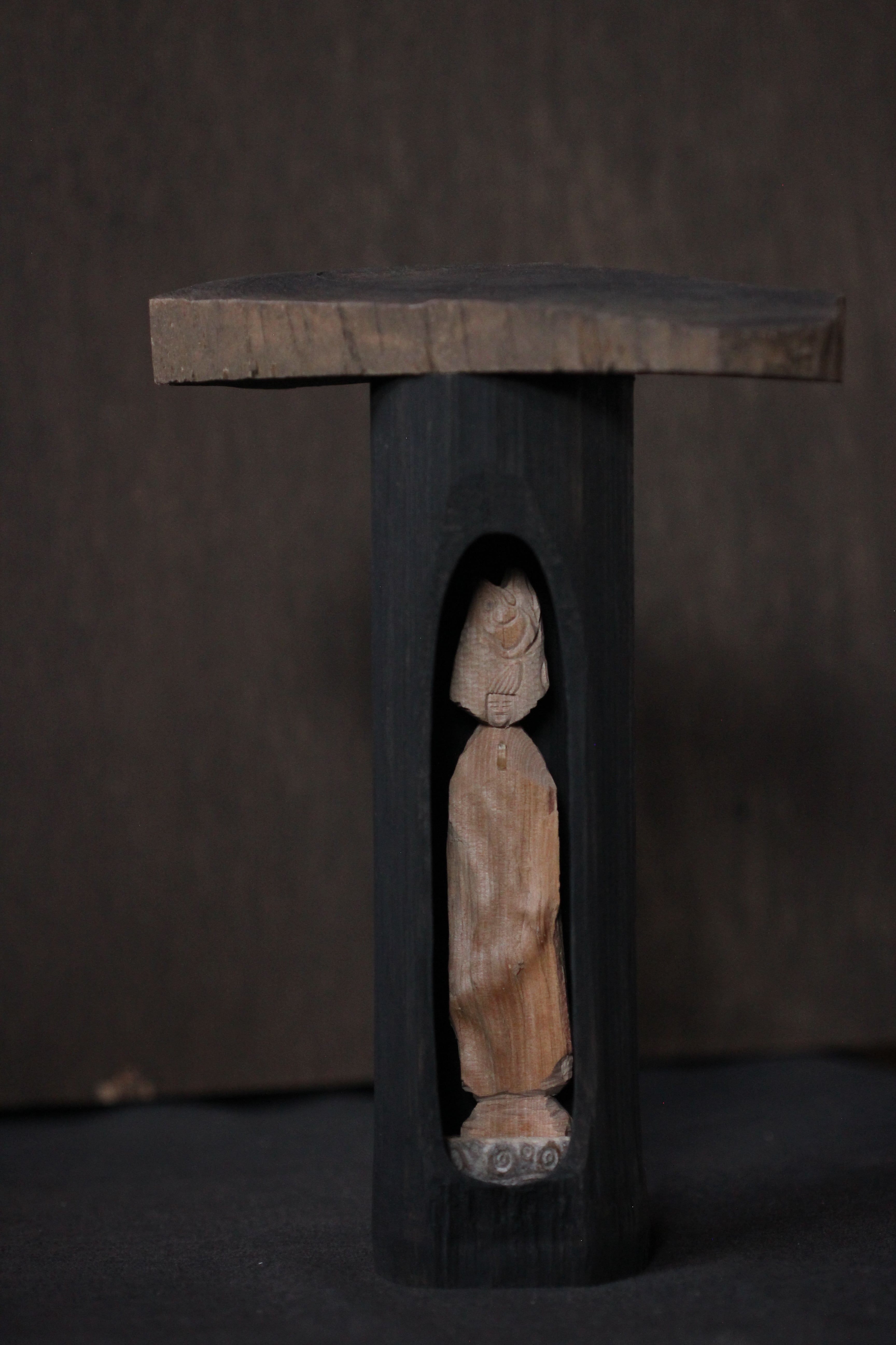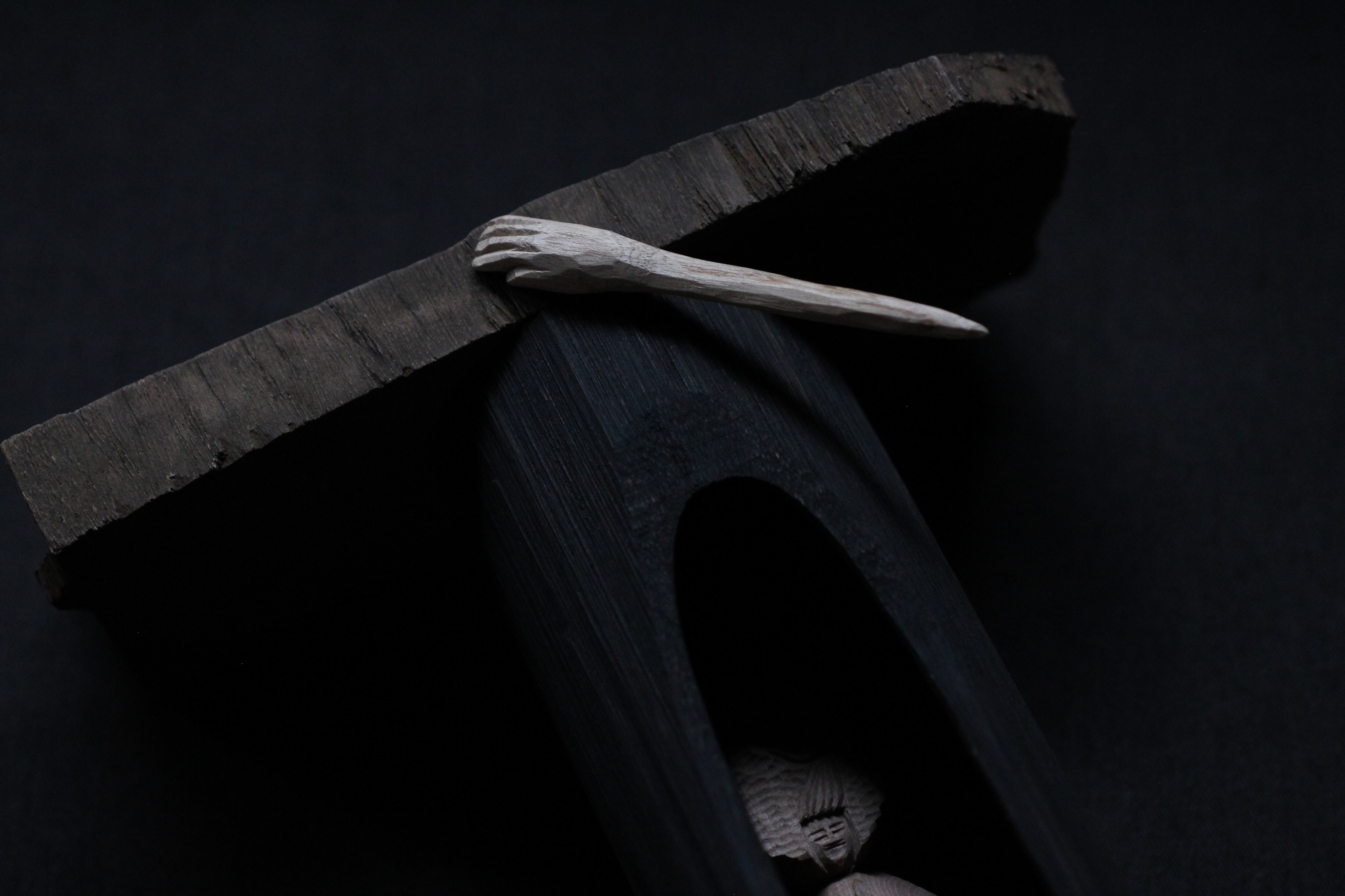 那珂川流域の椿の割り面の自然造形を活かして彫りだした善女虎鱸玉立像(虎鱸仏:ばすぶつ)です。スモールマウスブツともいいます。