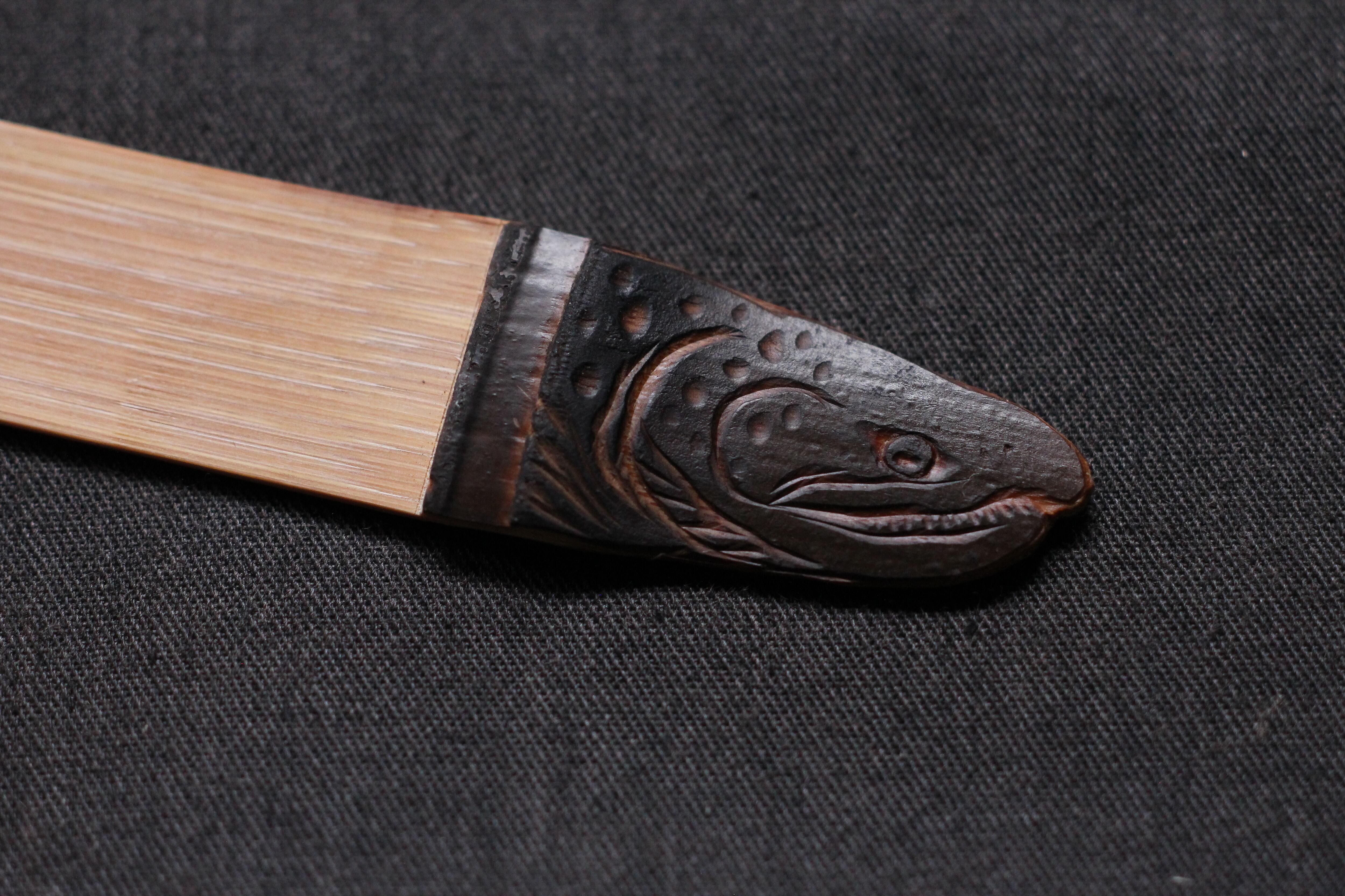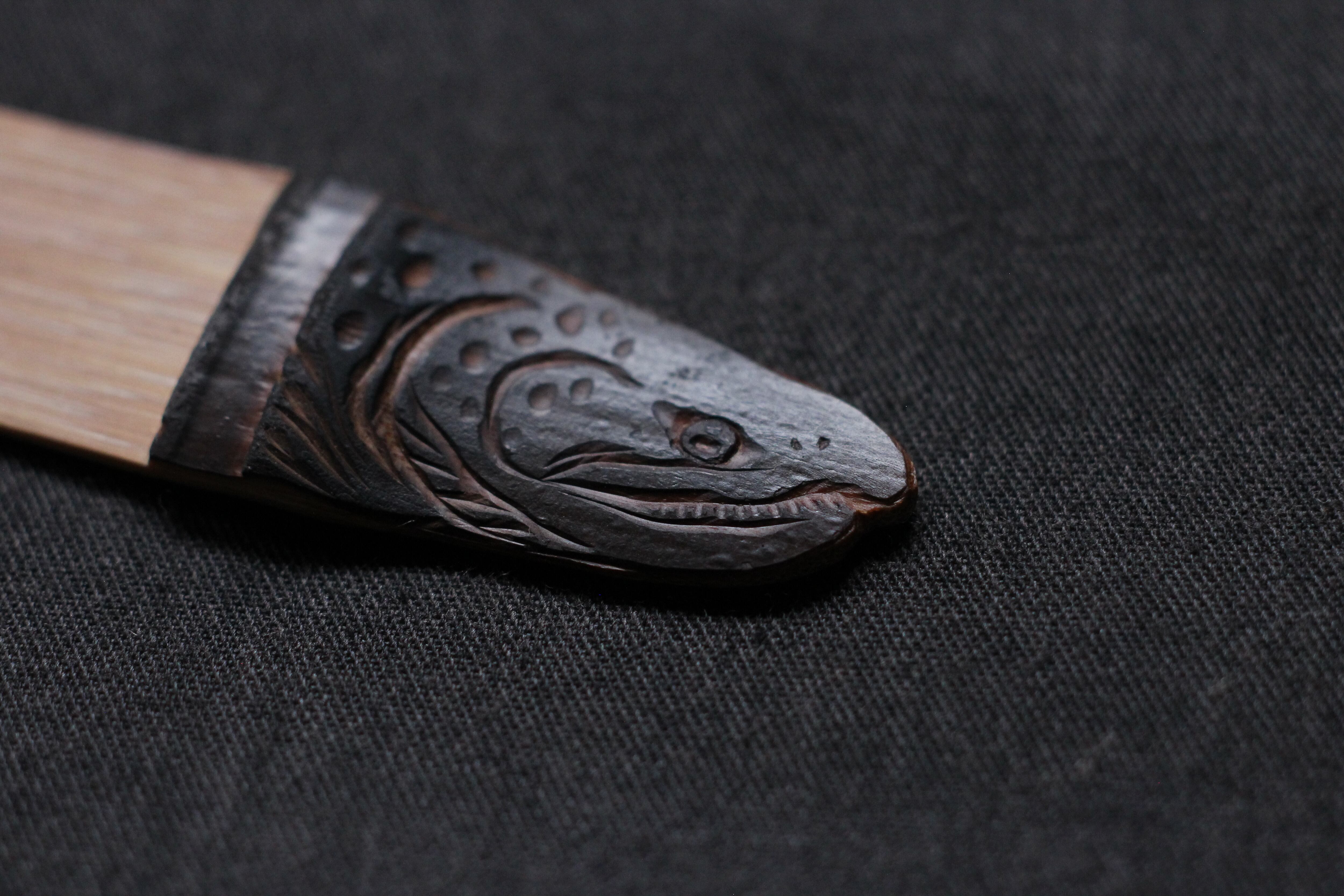 鮭鱒を彫りこみました。