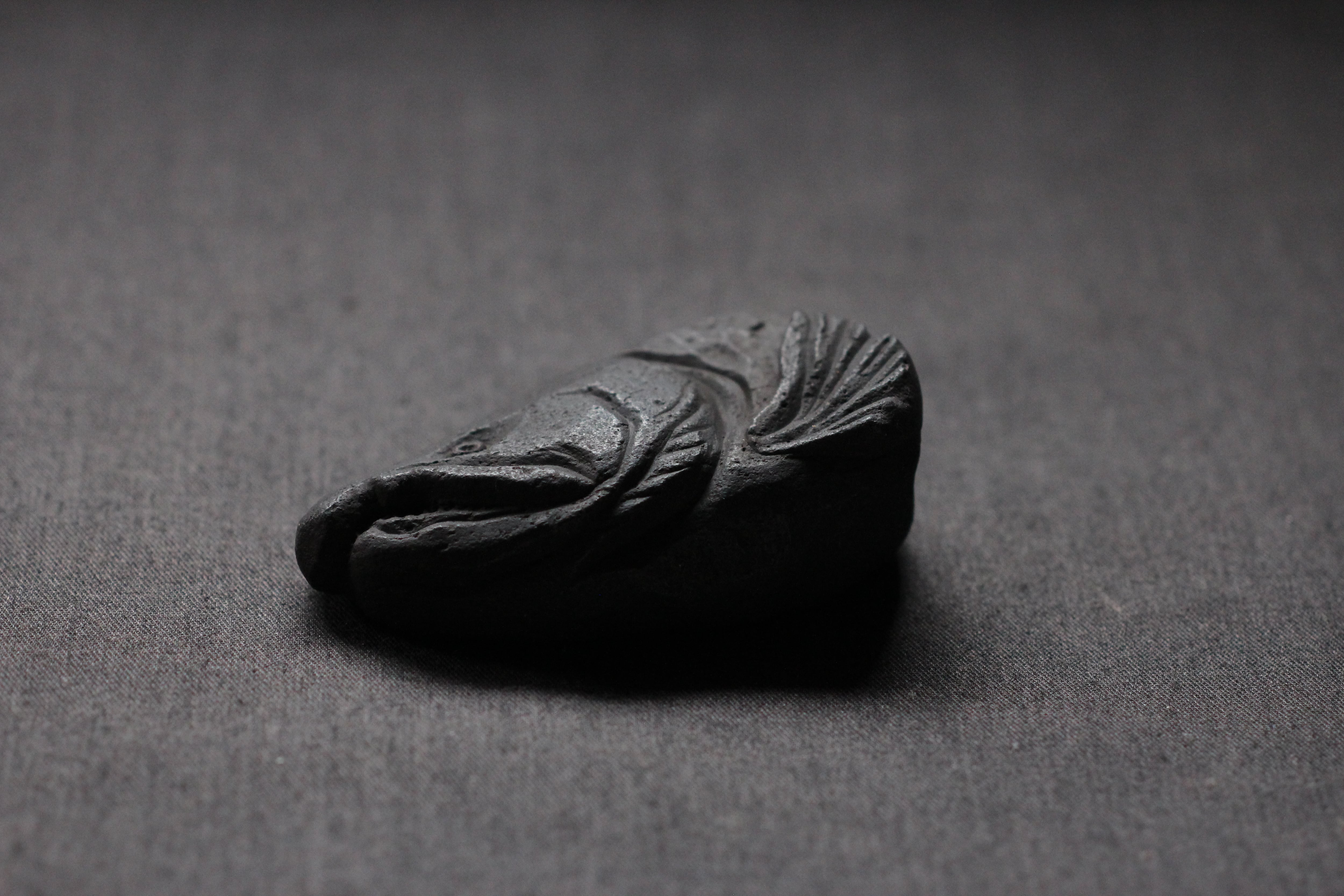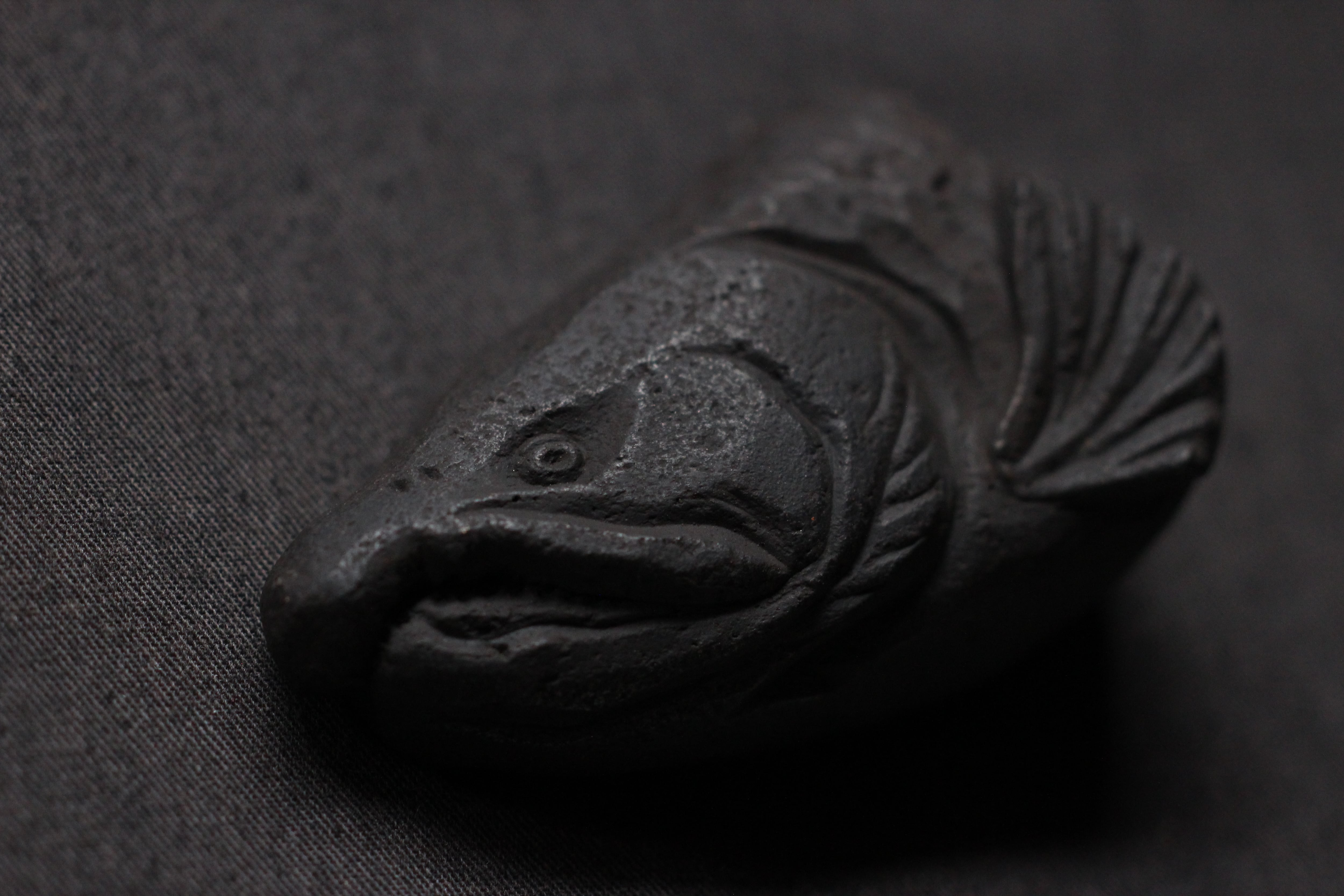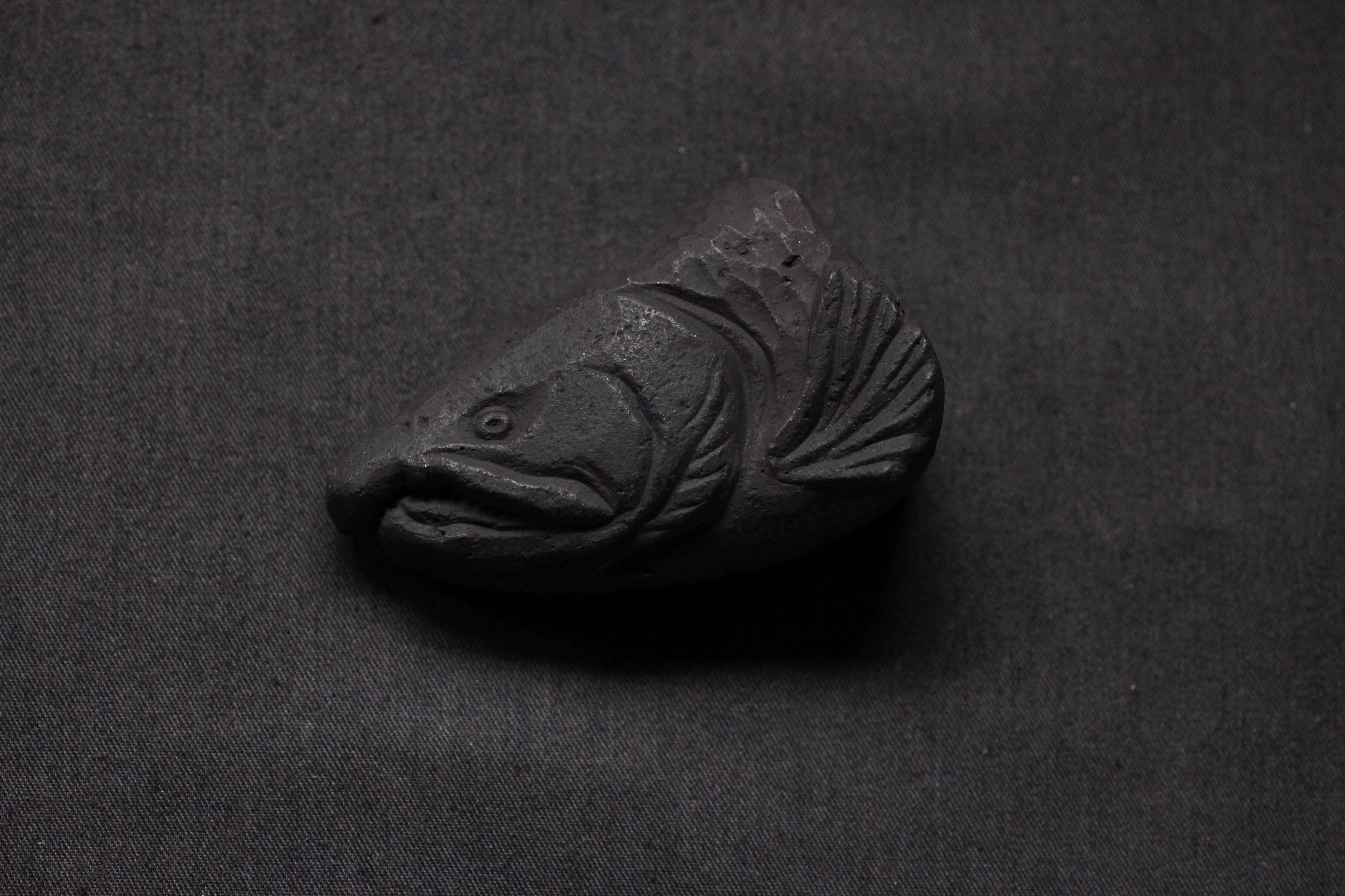 那珂川流域粘土から製作した鱒首文鎮「岩魚」。