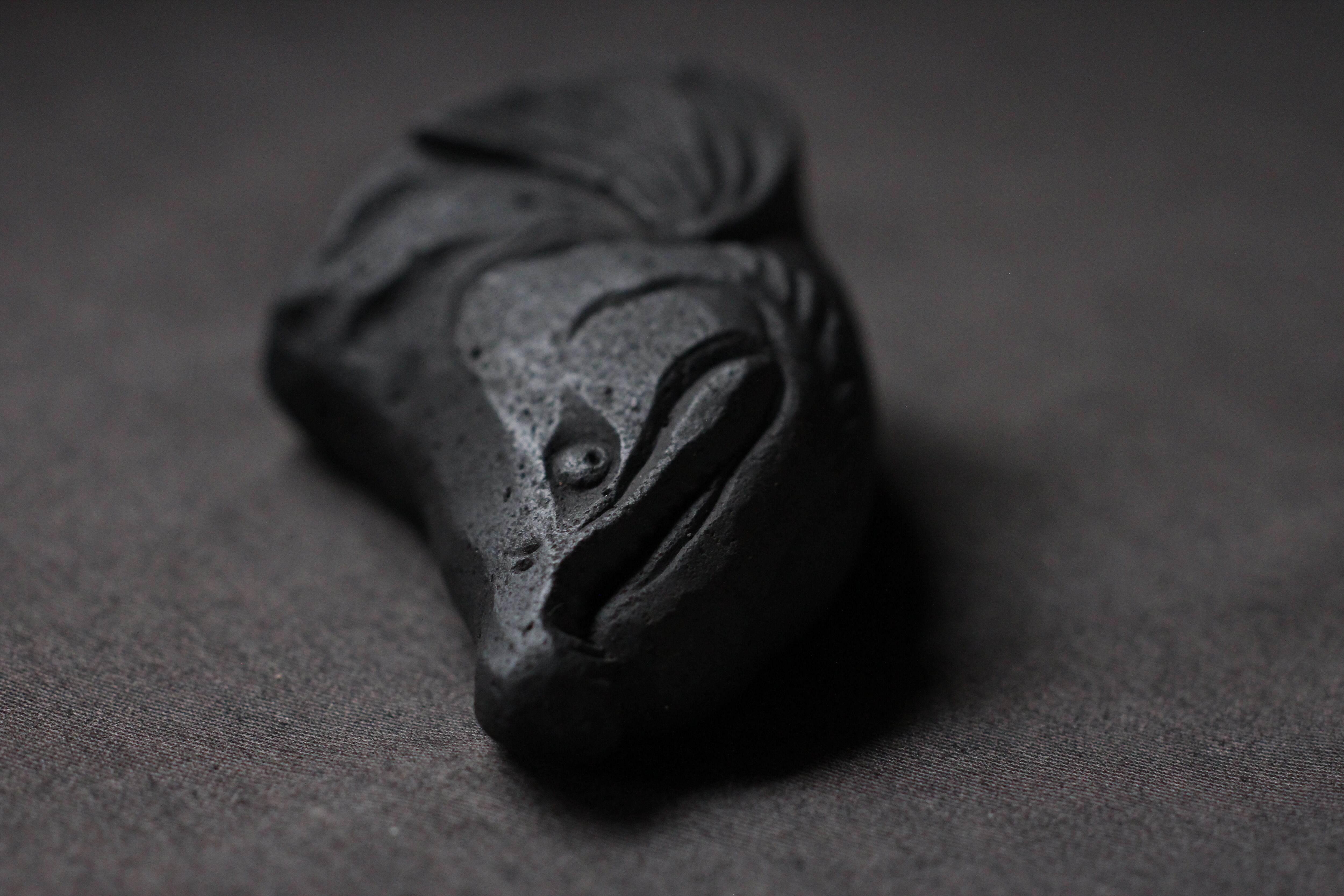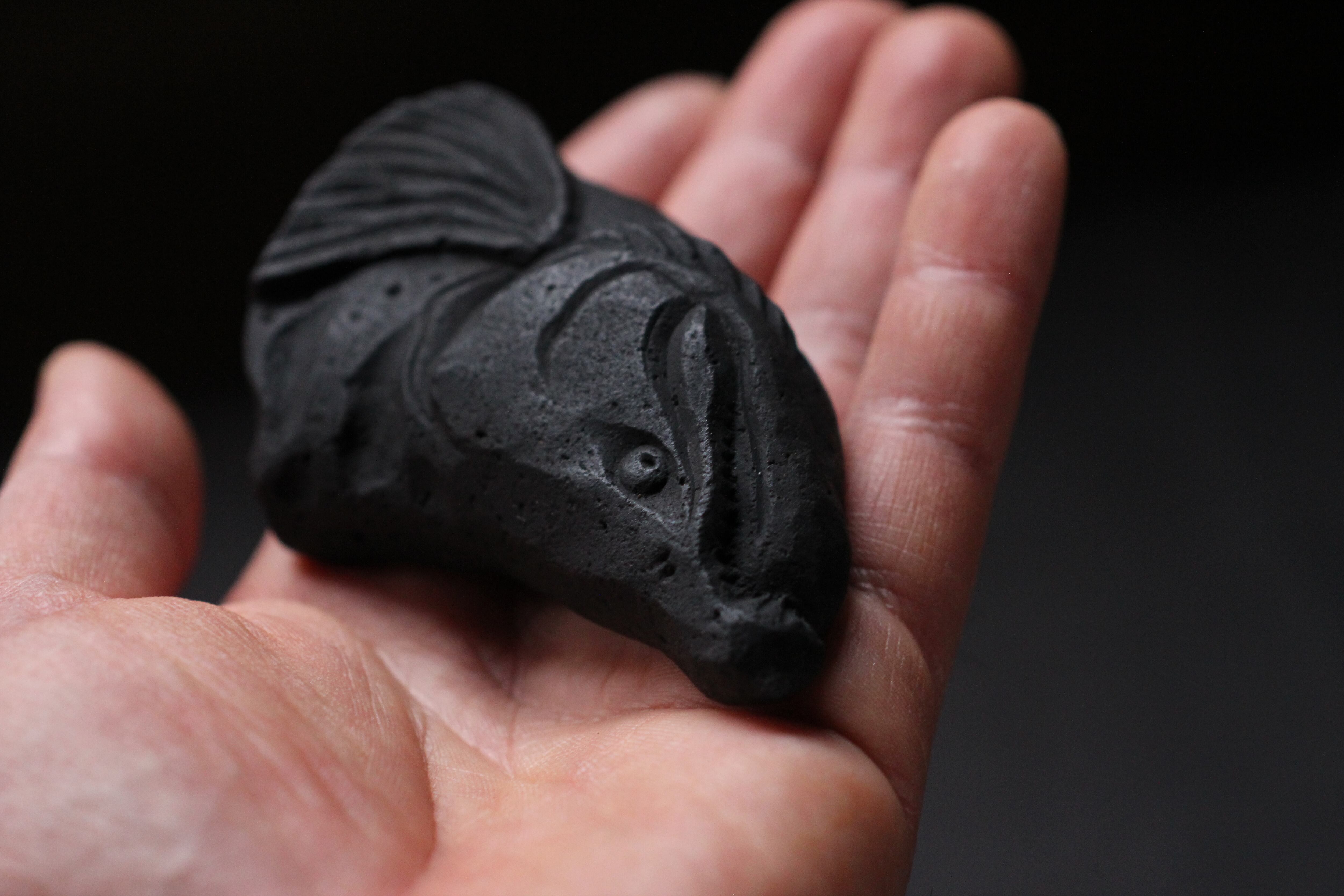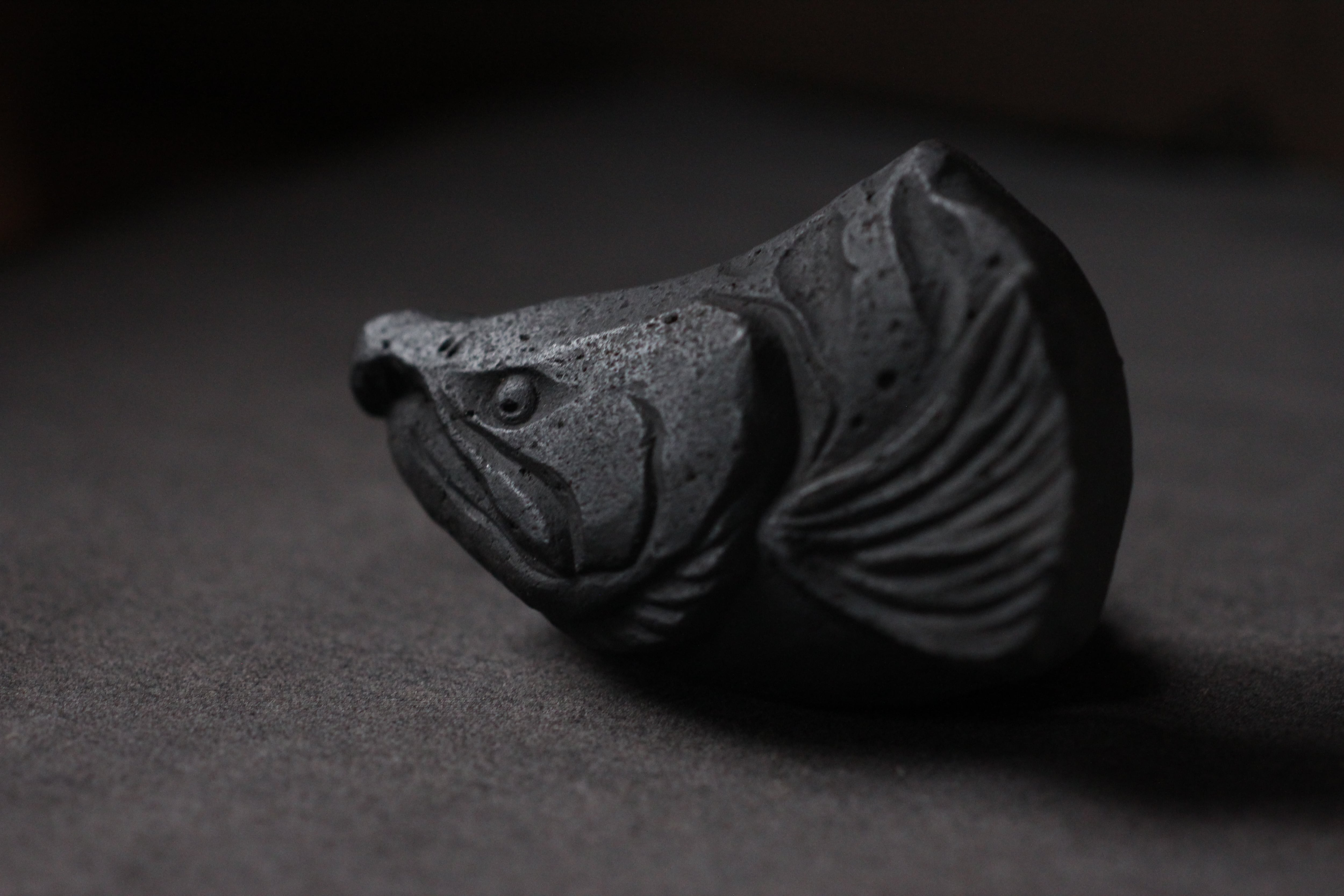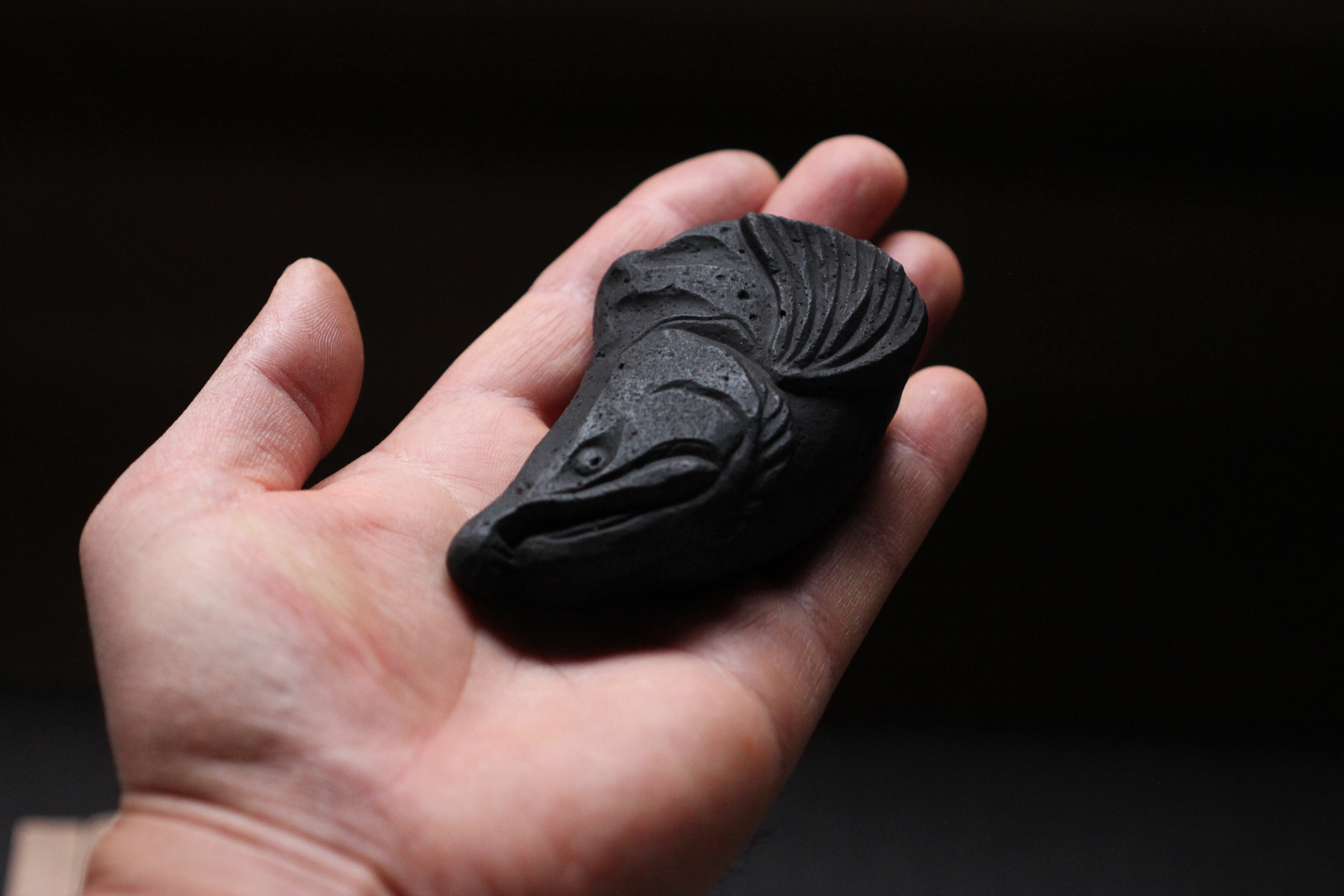 那珂川流域粘土から製作した鱒首文鎮「山女魚」。