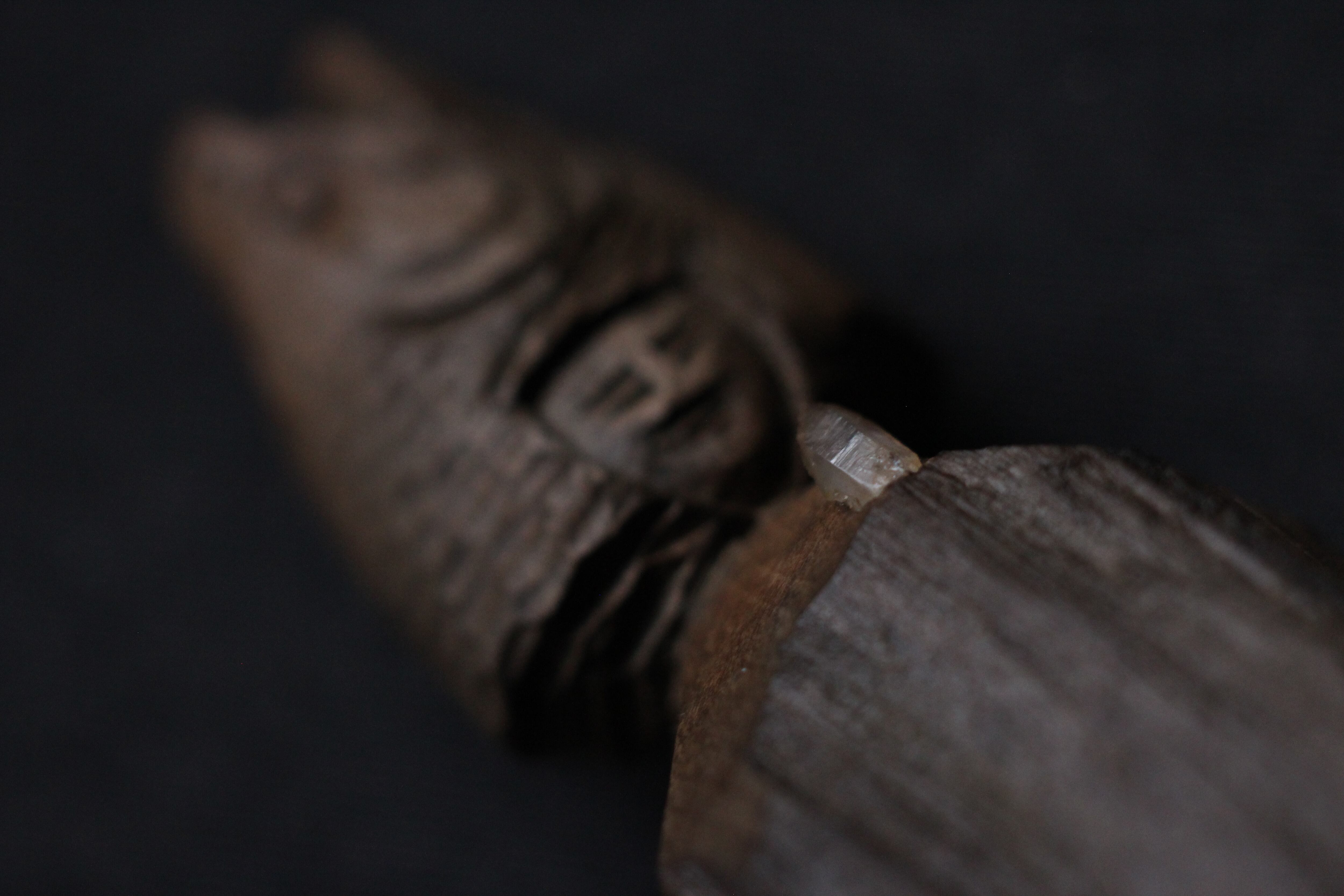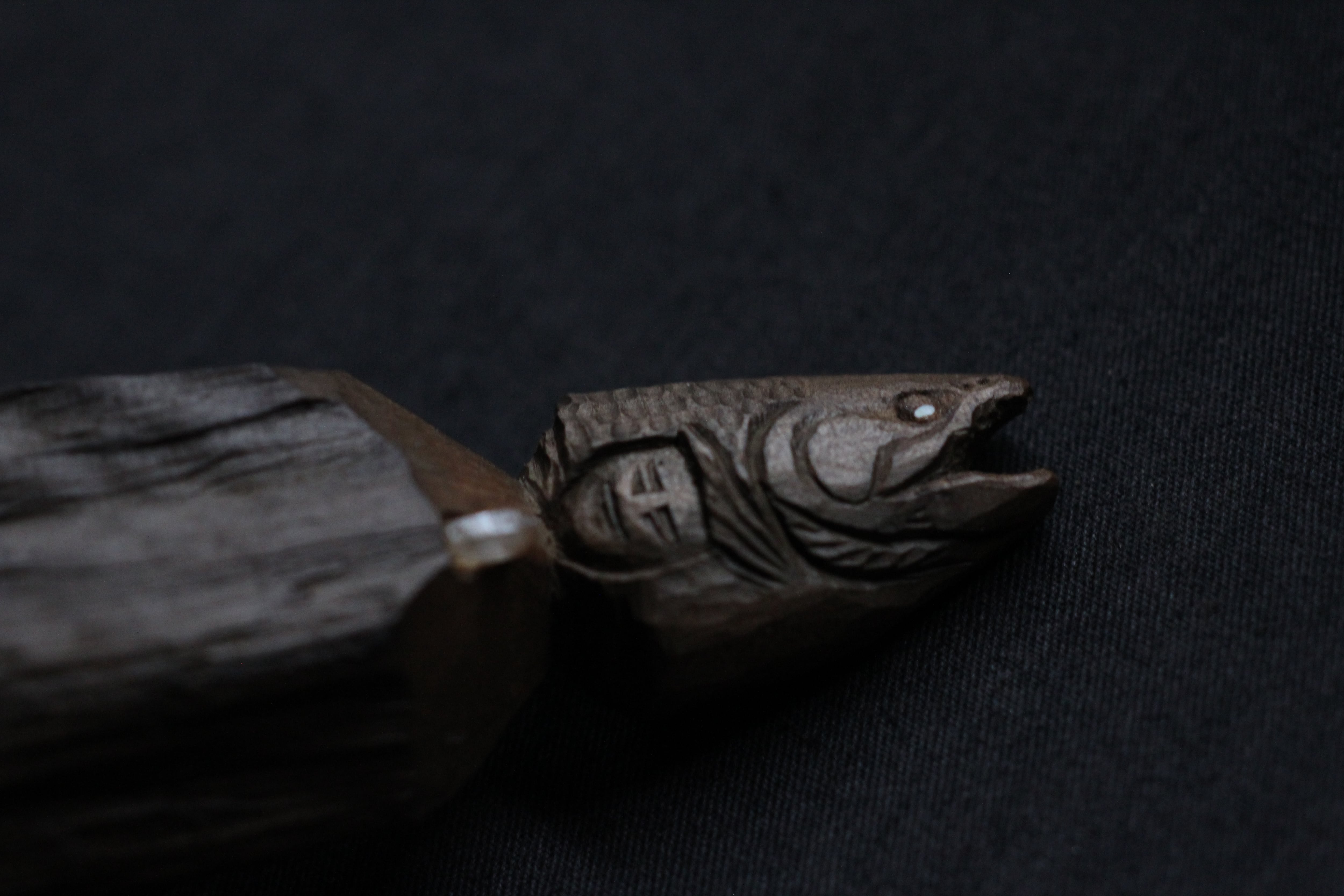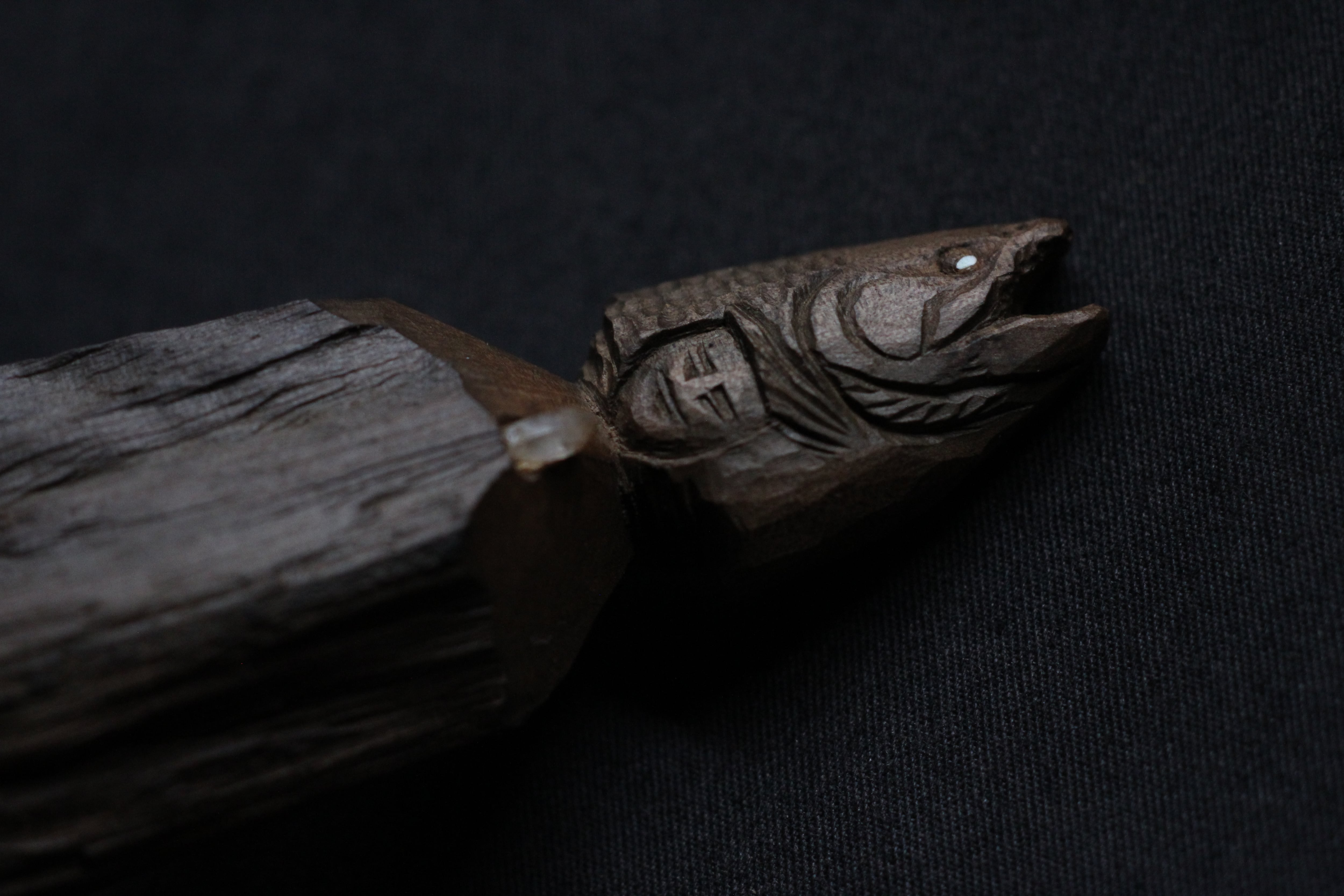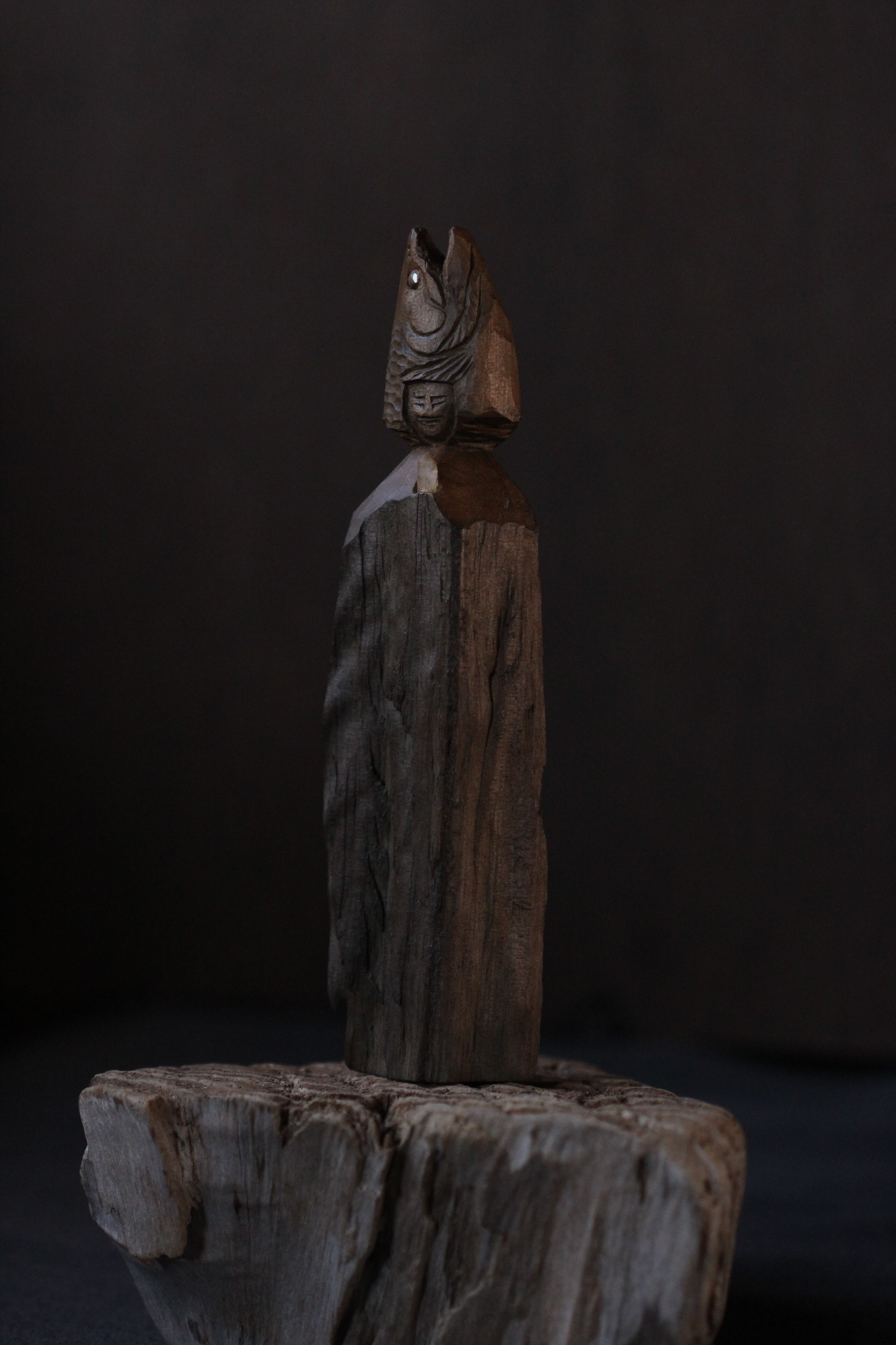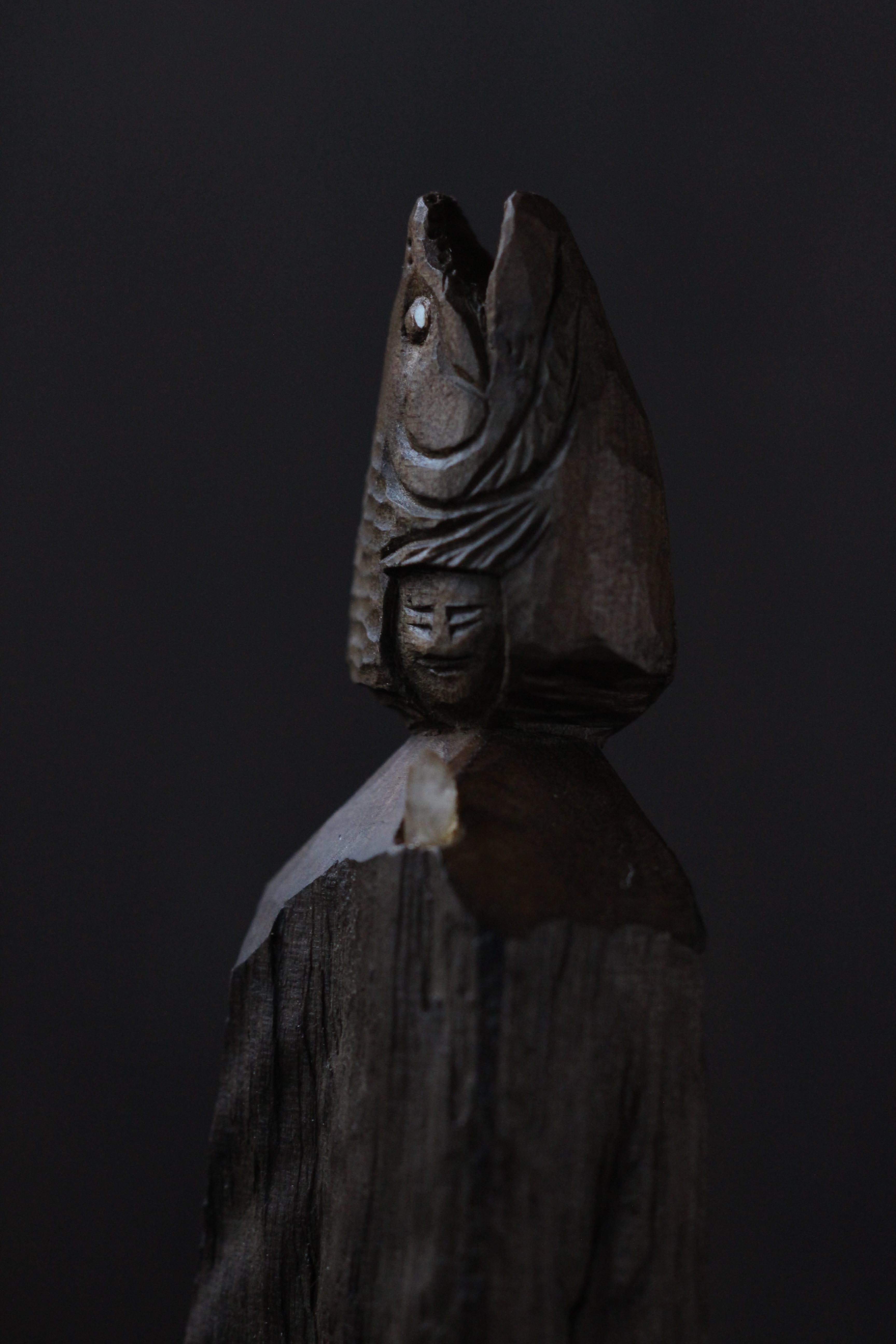 那珂川流域の椿の割り面の自然造形を活かして彫りだした善女鱒玉立像(鱒仏)です。