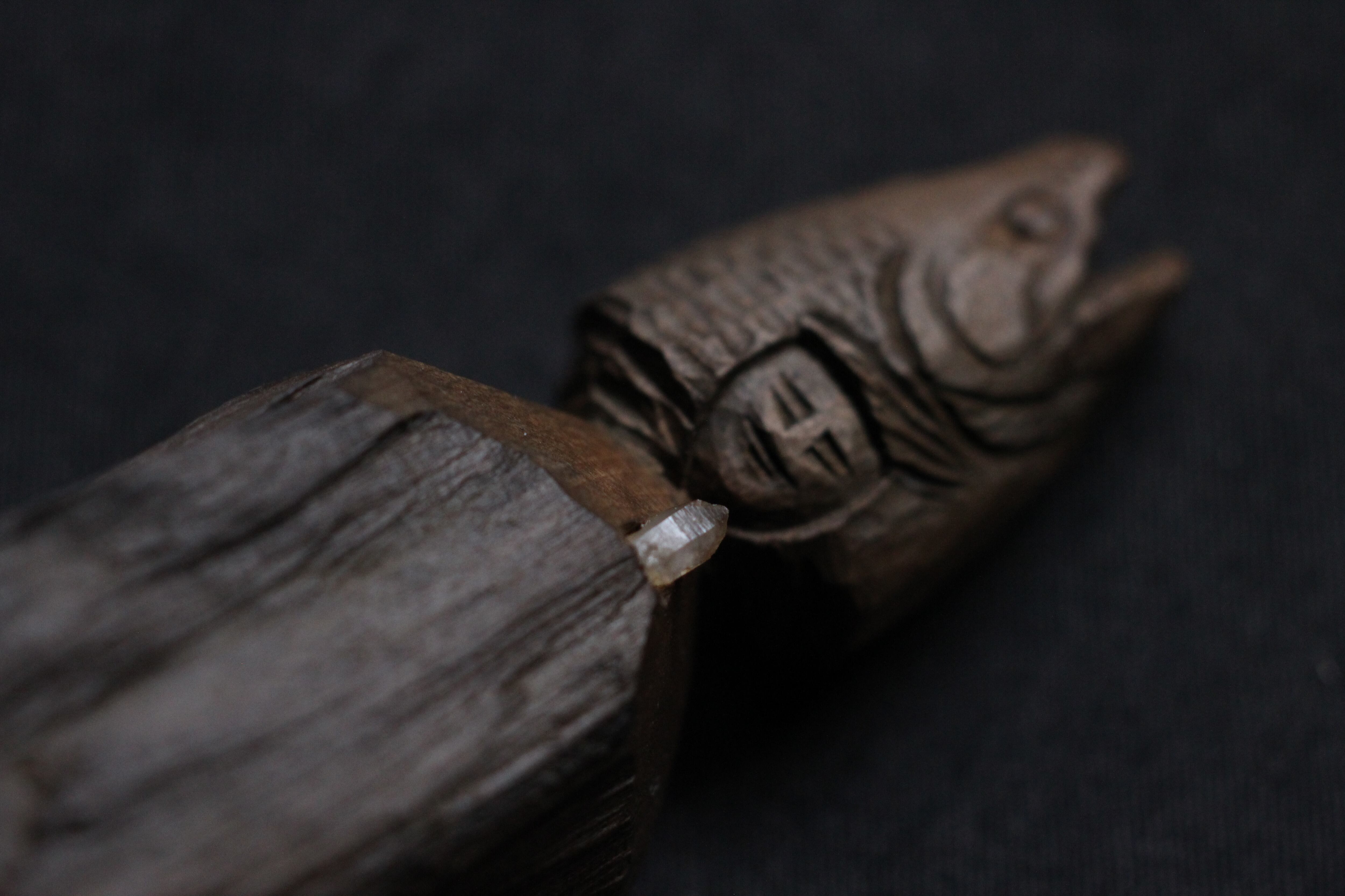頭は鱒(虹鱒)、胸元に流域の水晶を持ちます。