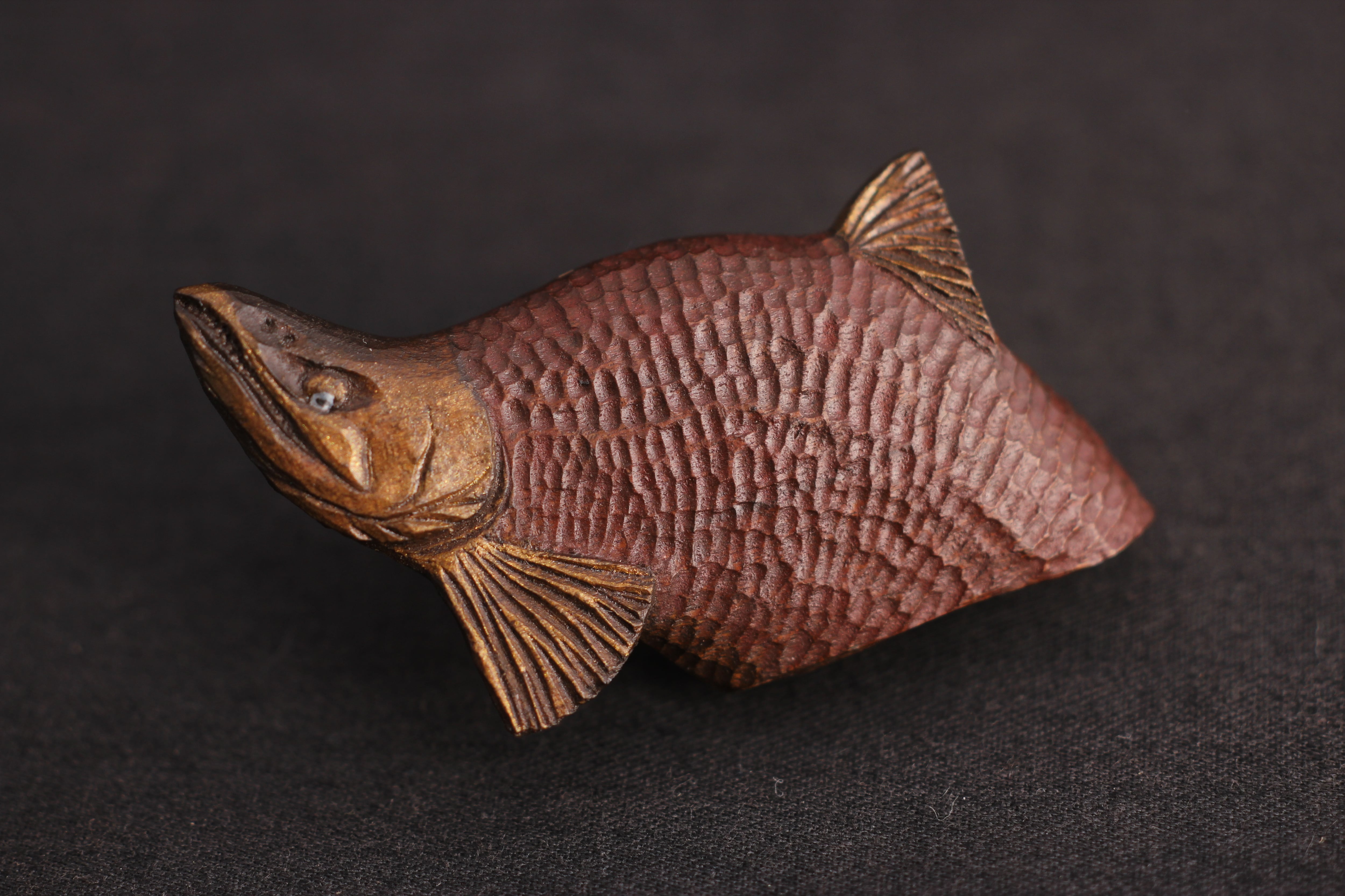 那珂川流域のヤマザクラから彫りだしたヒメマスのブローチです。
