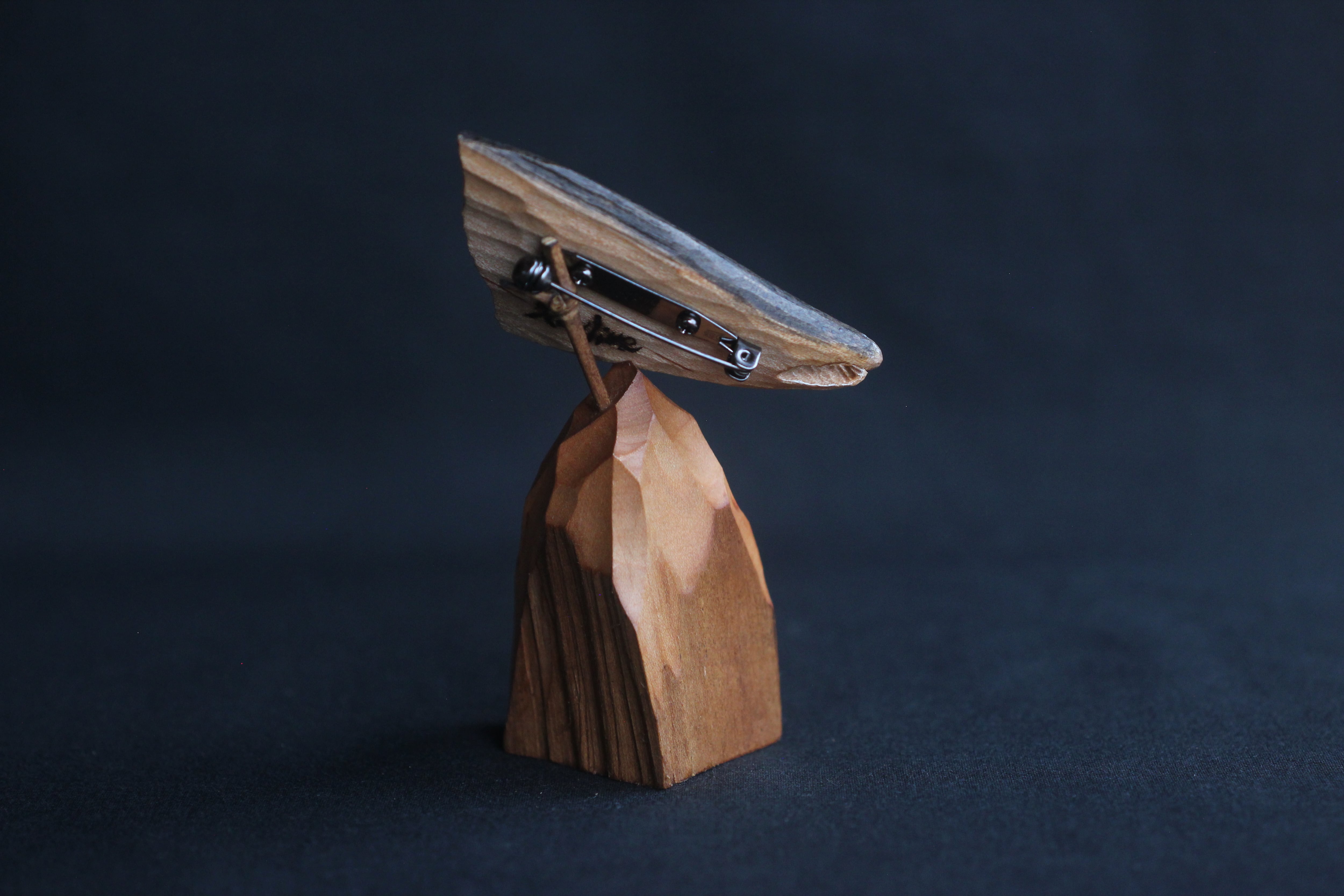 台座はヤマザクラに彫りを加えたオリジナル。ブローチを掛ける部分には竹を使用しました。
