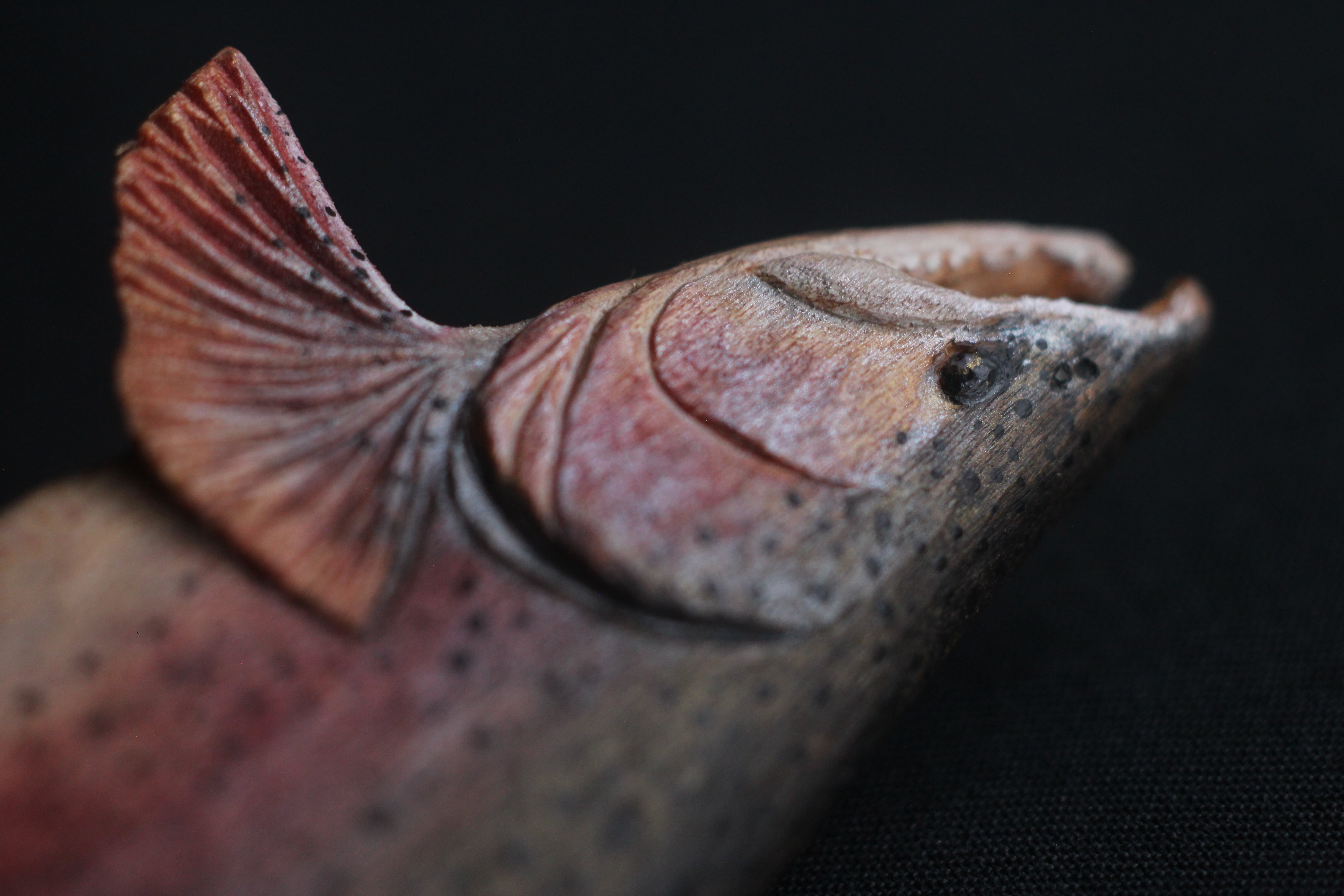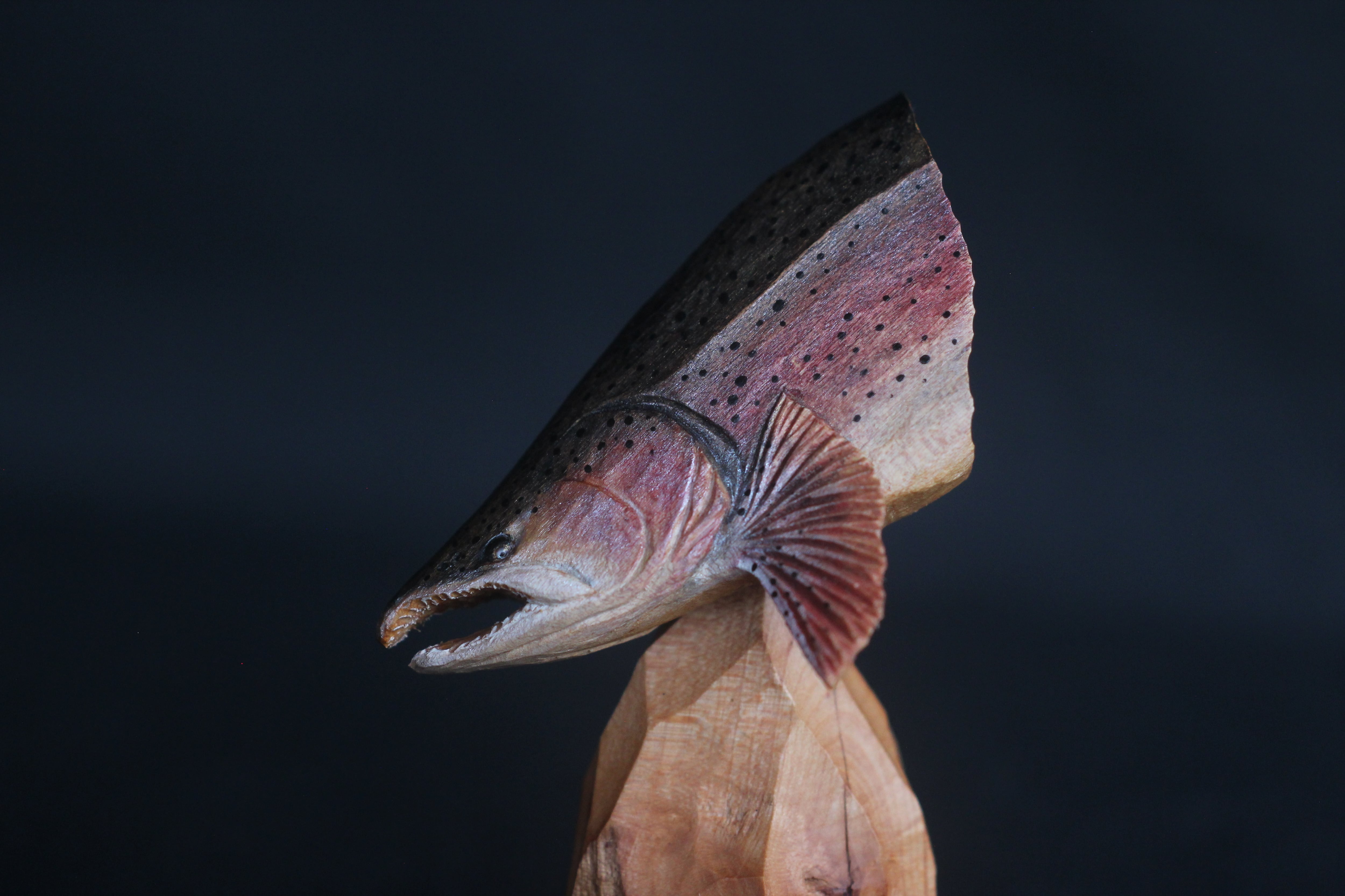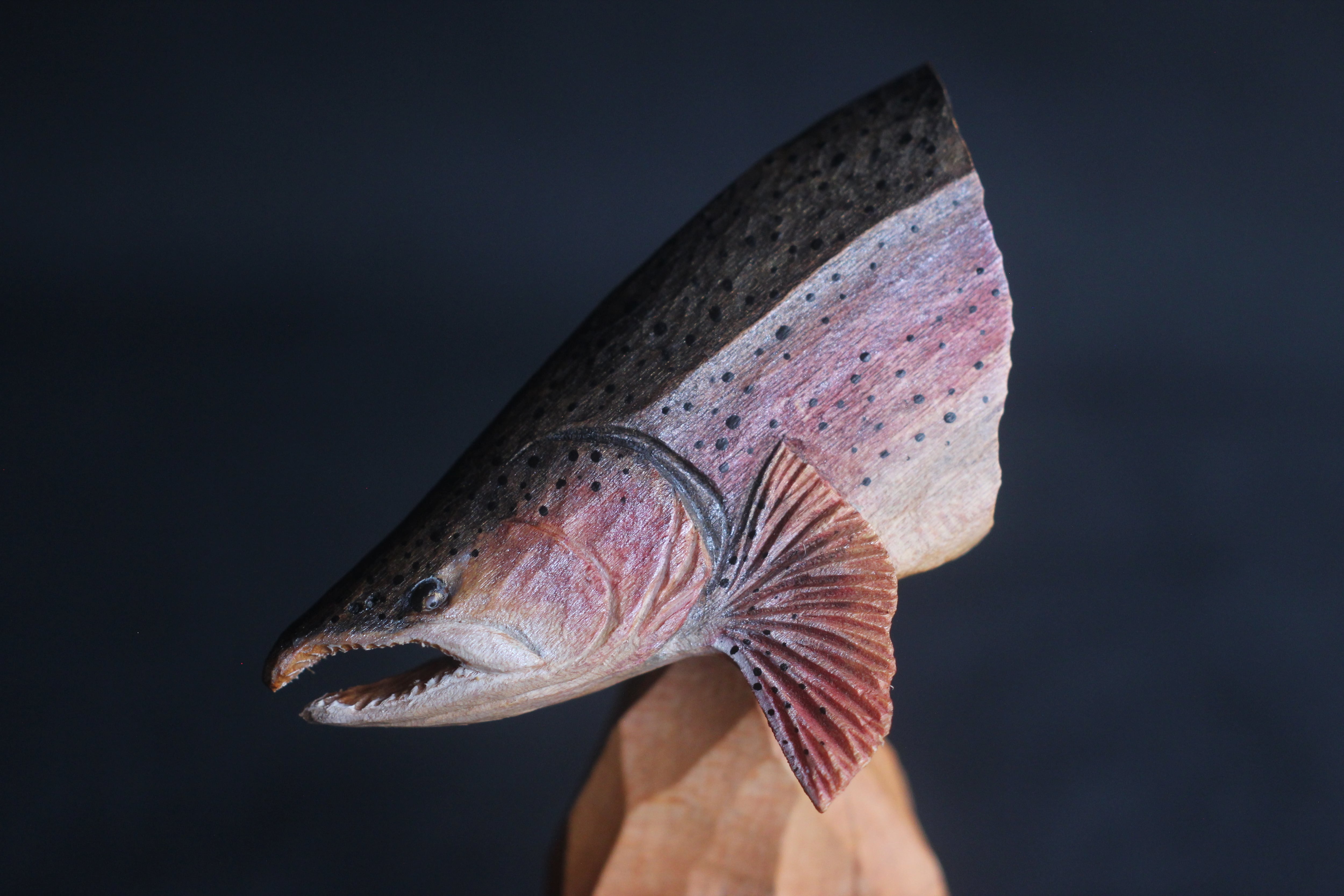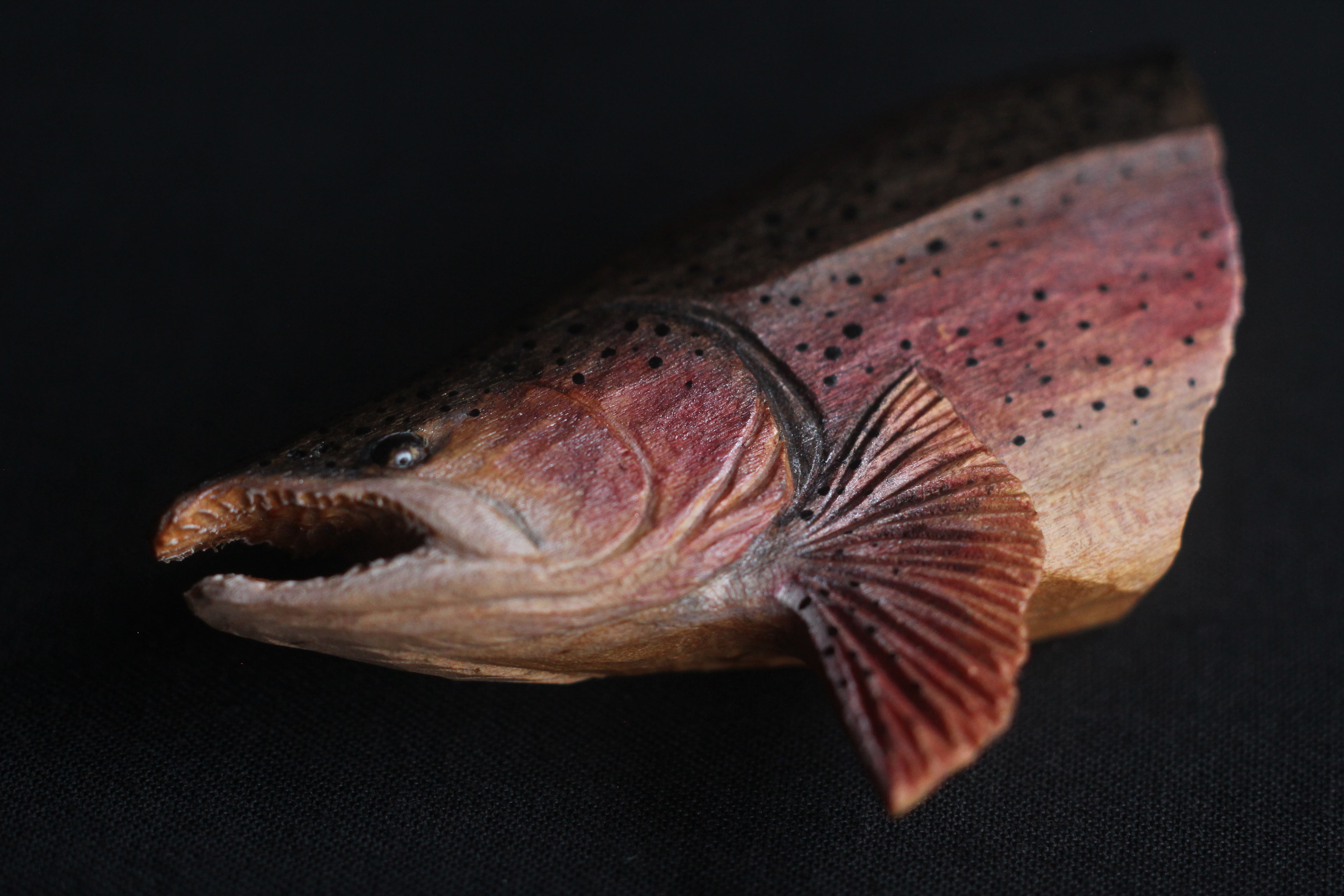 那珂川流域のヤマザクラから彫りだしたニジマスのブローチです。