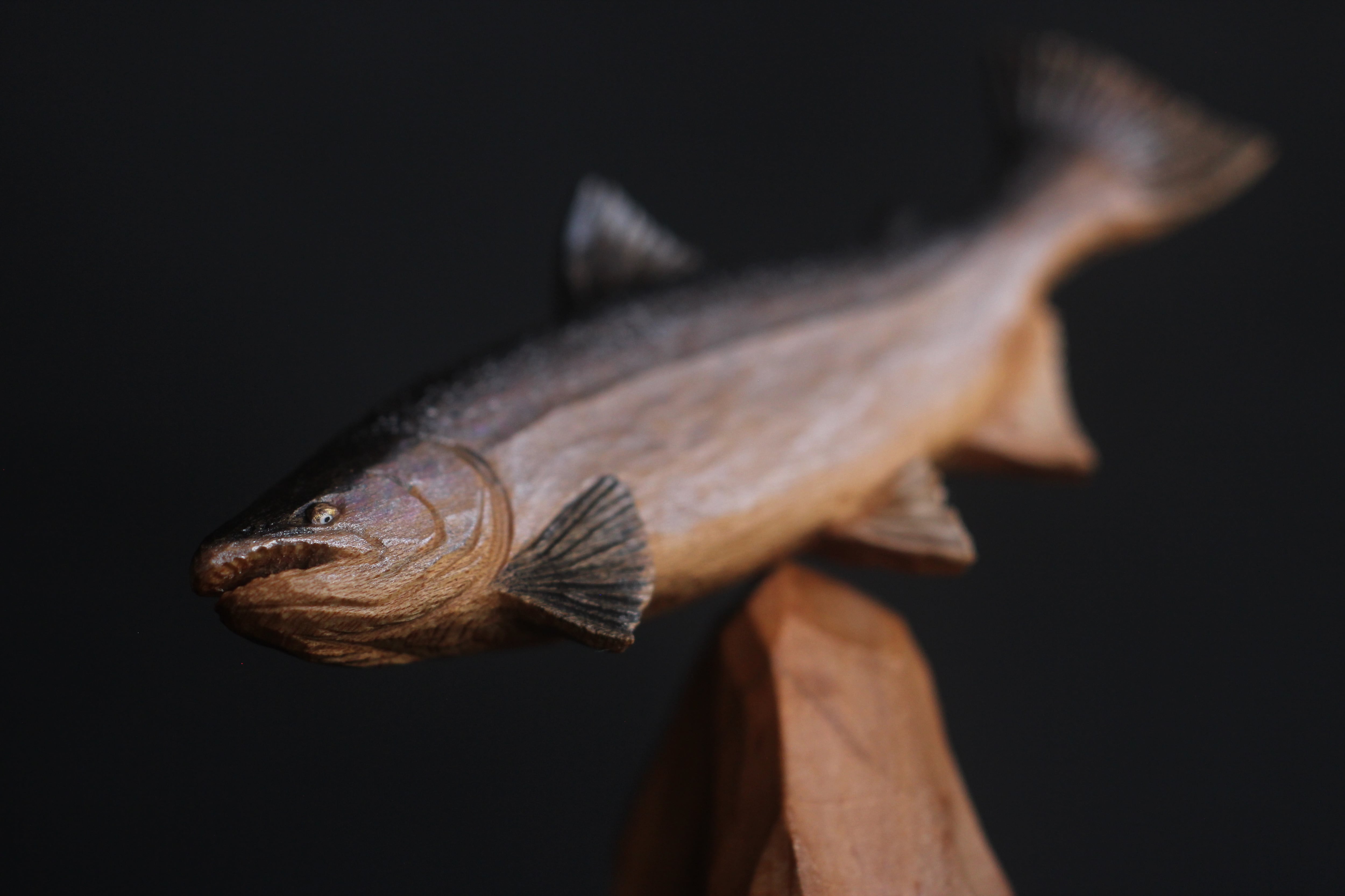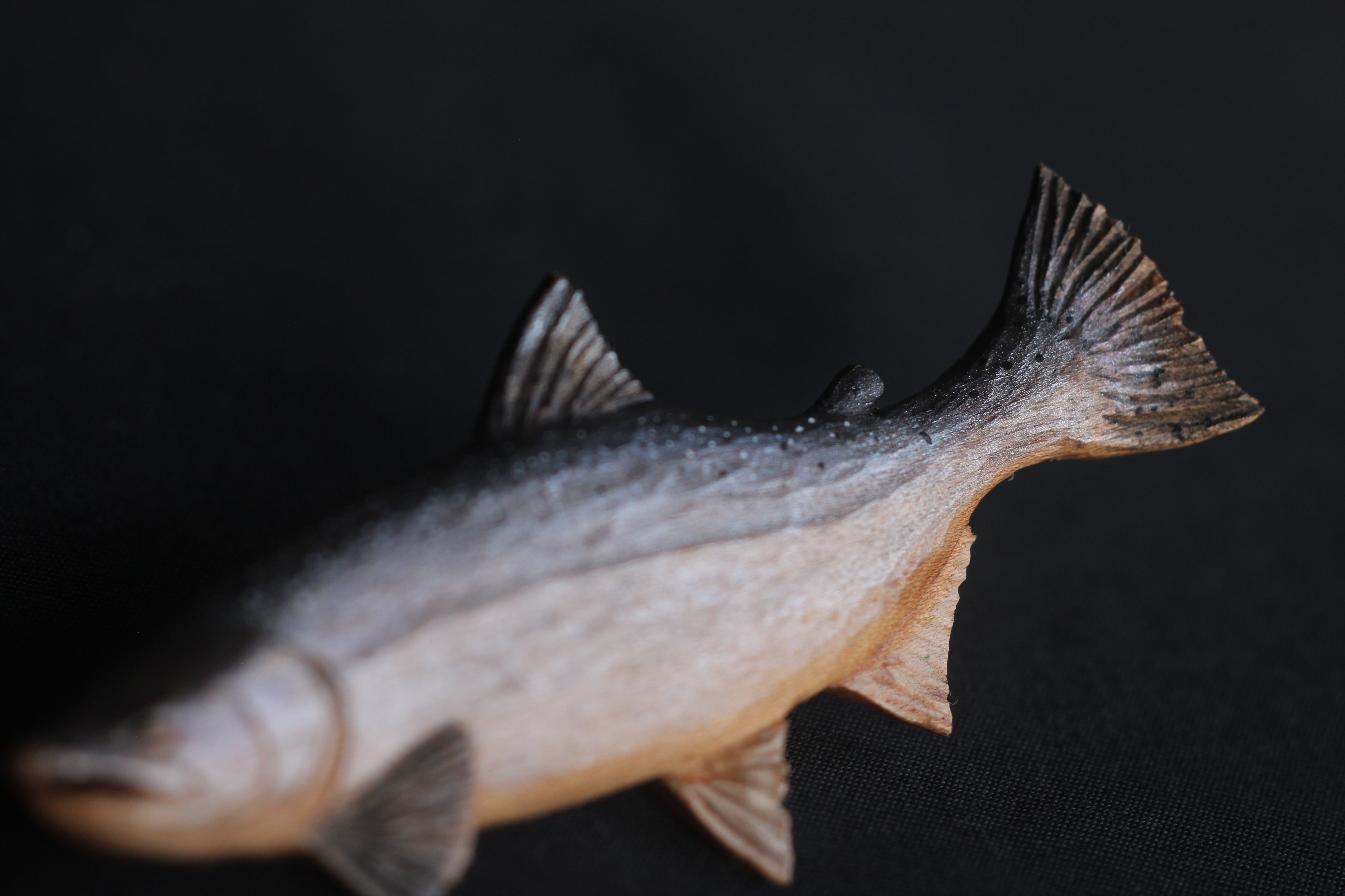 那珂川流域のヤマザクラから彫りだしたサクラマスのブローチです。