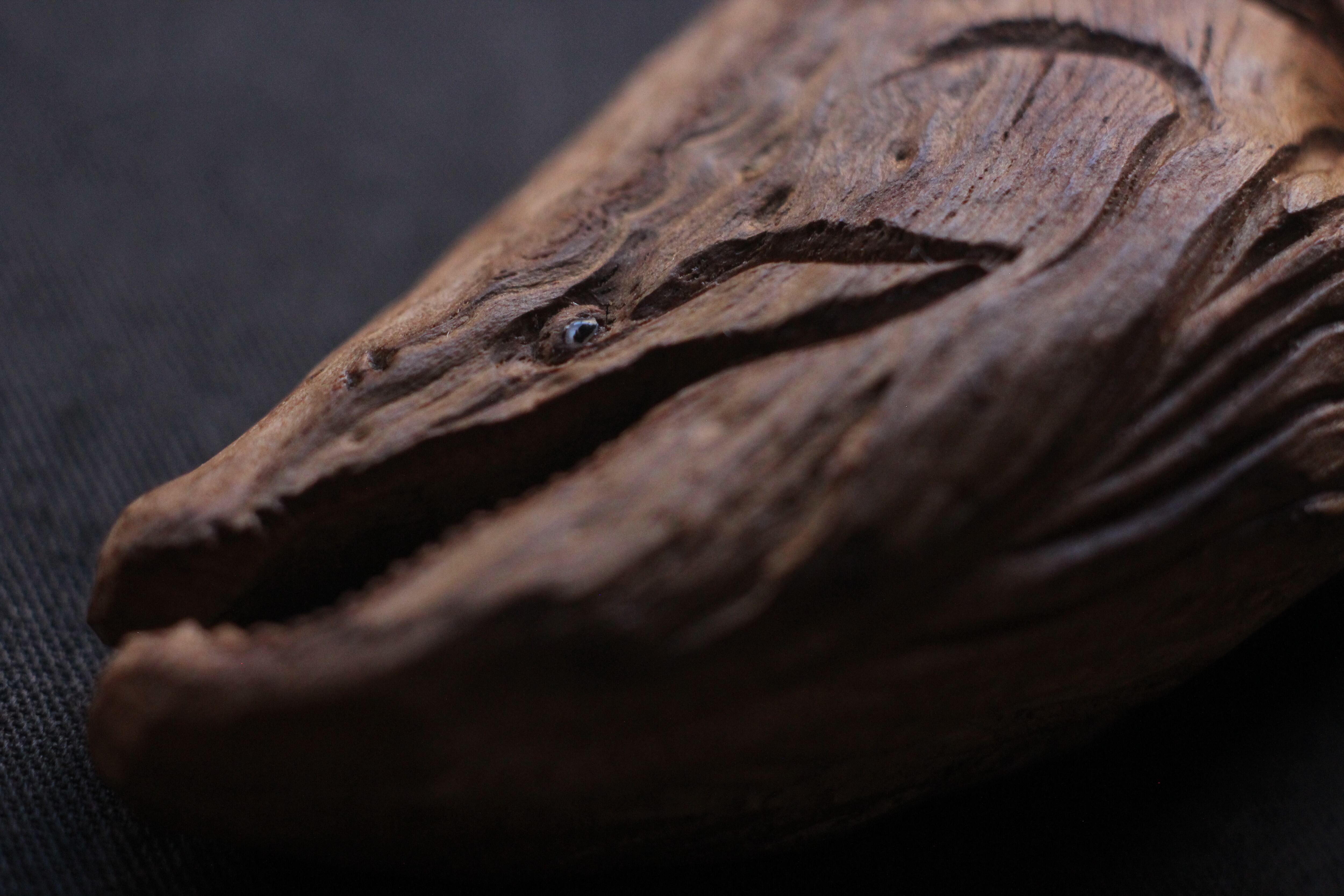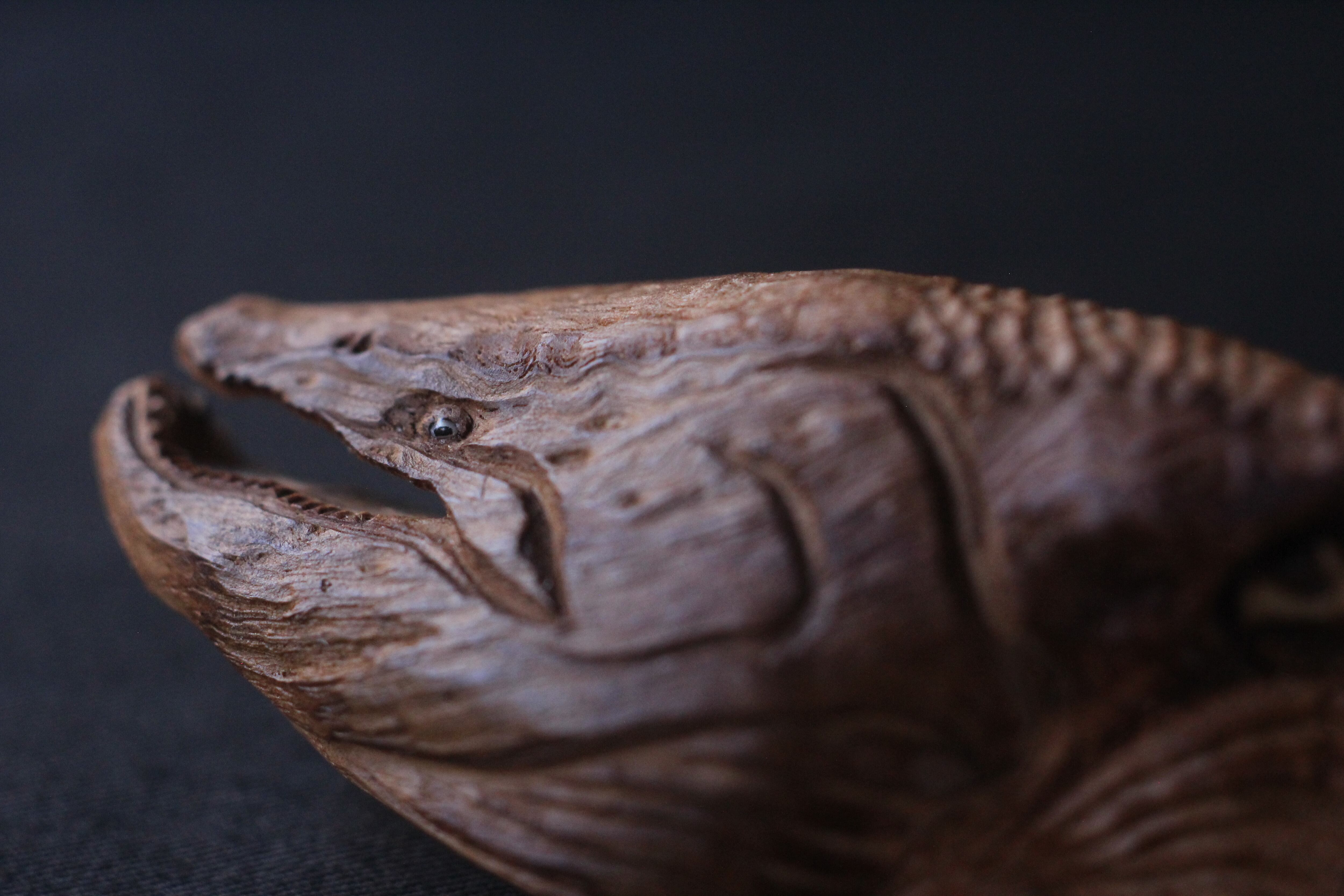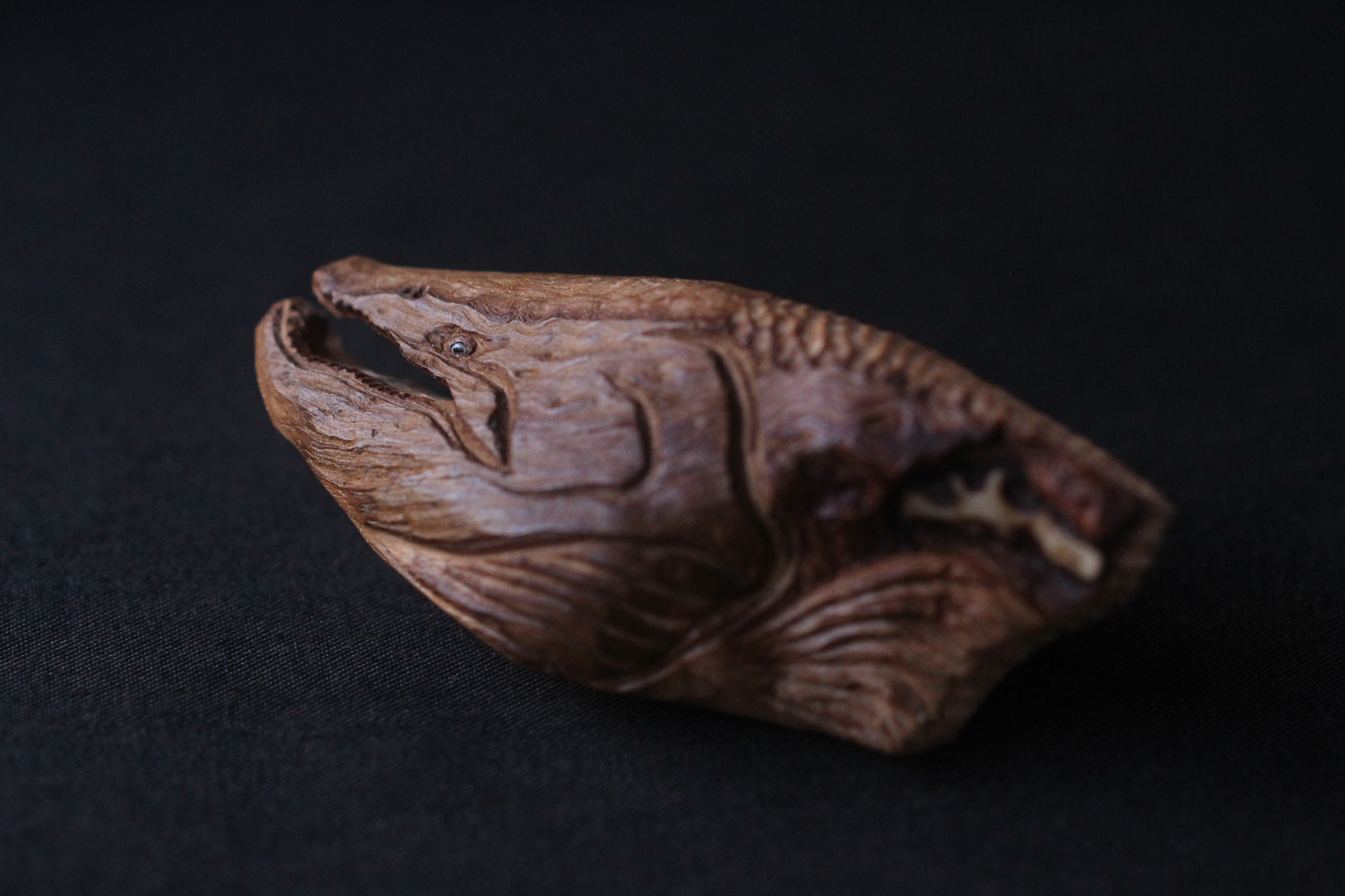 那珂川流域の栗倒木から彫りだした鱒のブローチ。