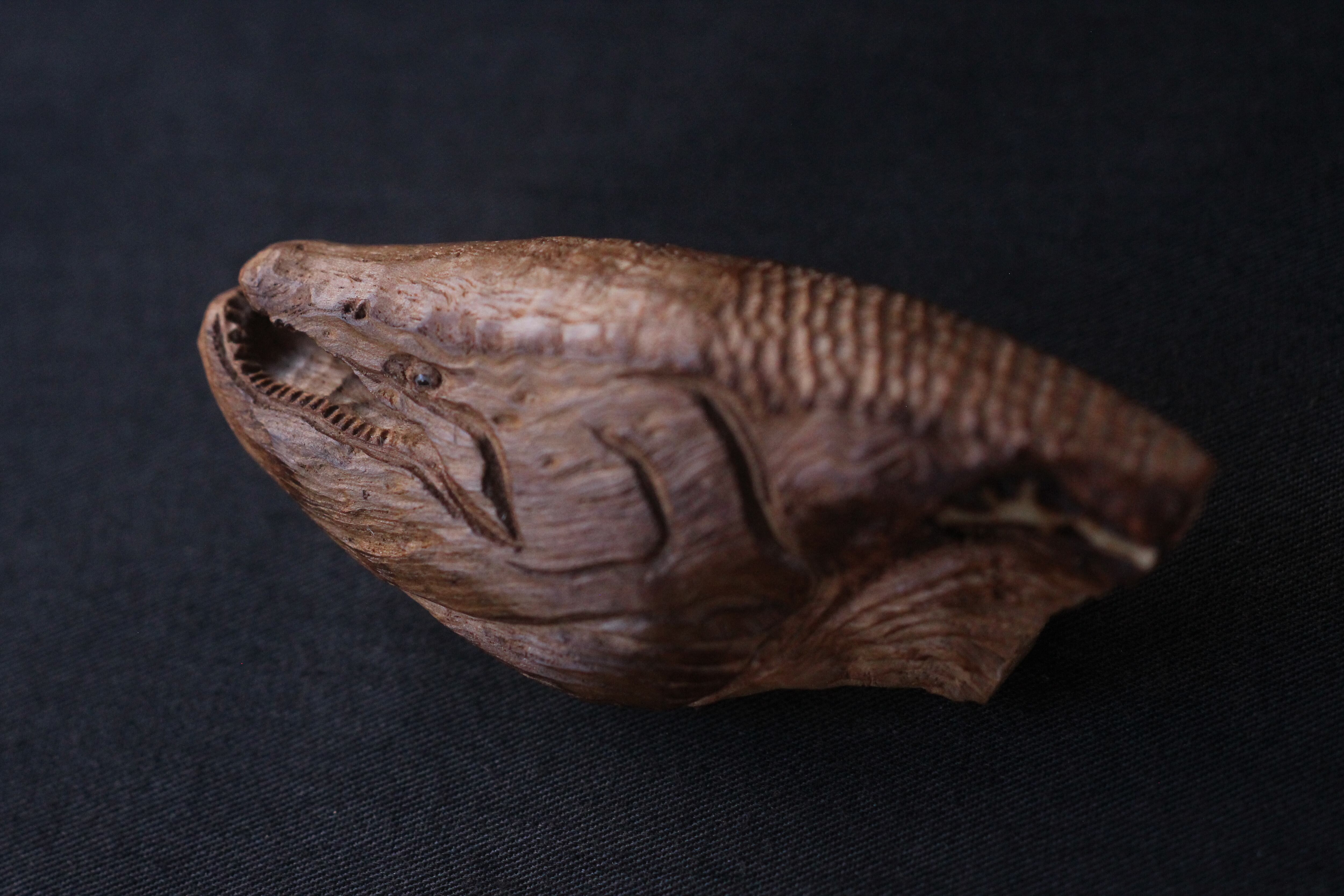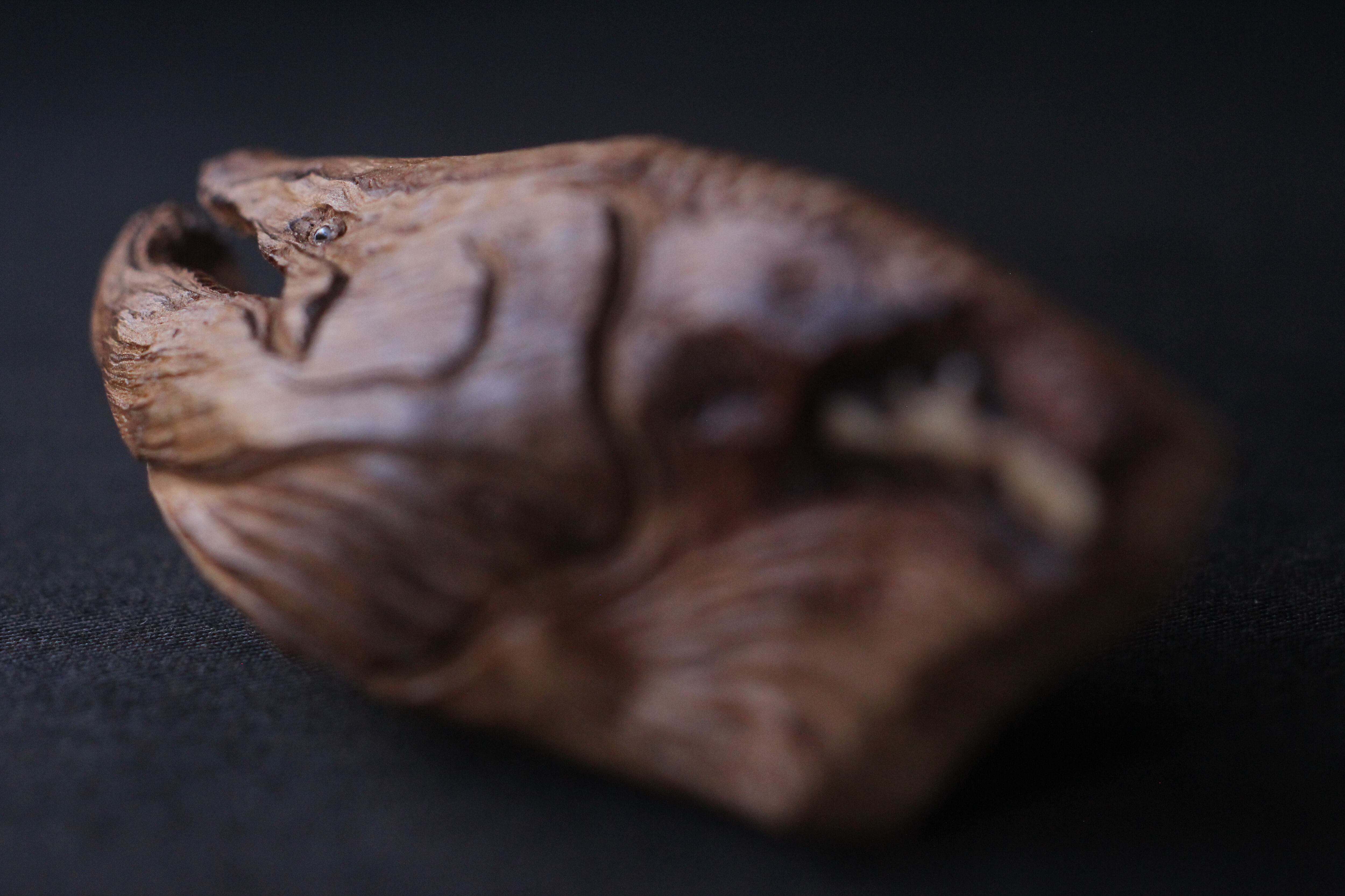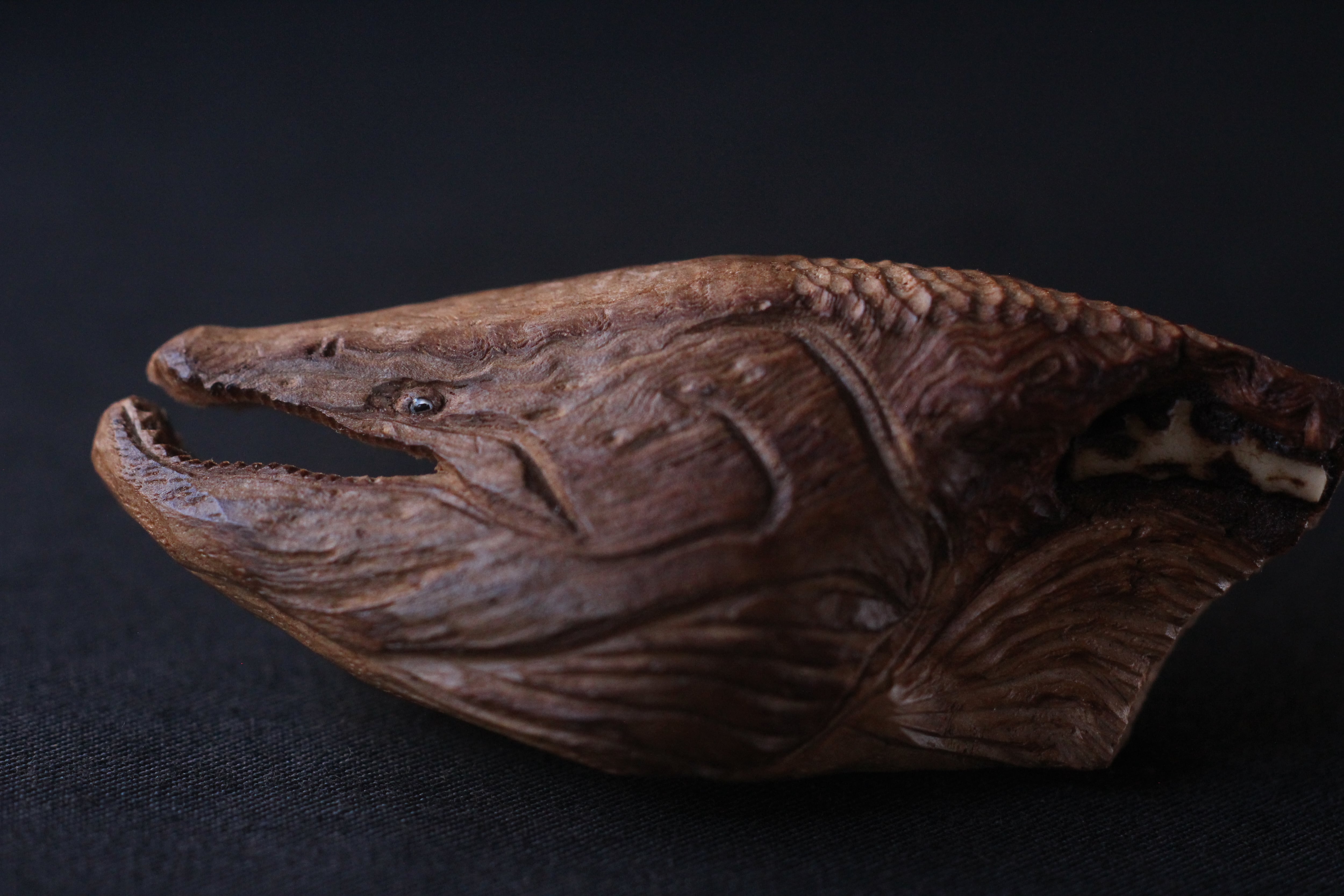那珂川流域の栗倒木から彫りだした鱒のブローチ。