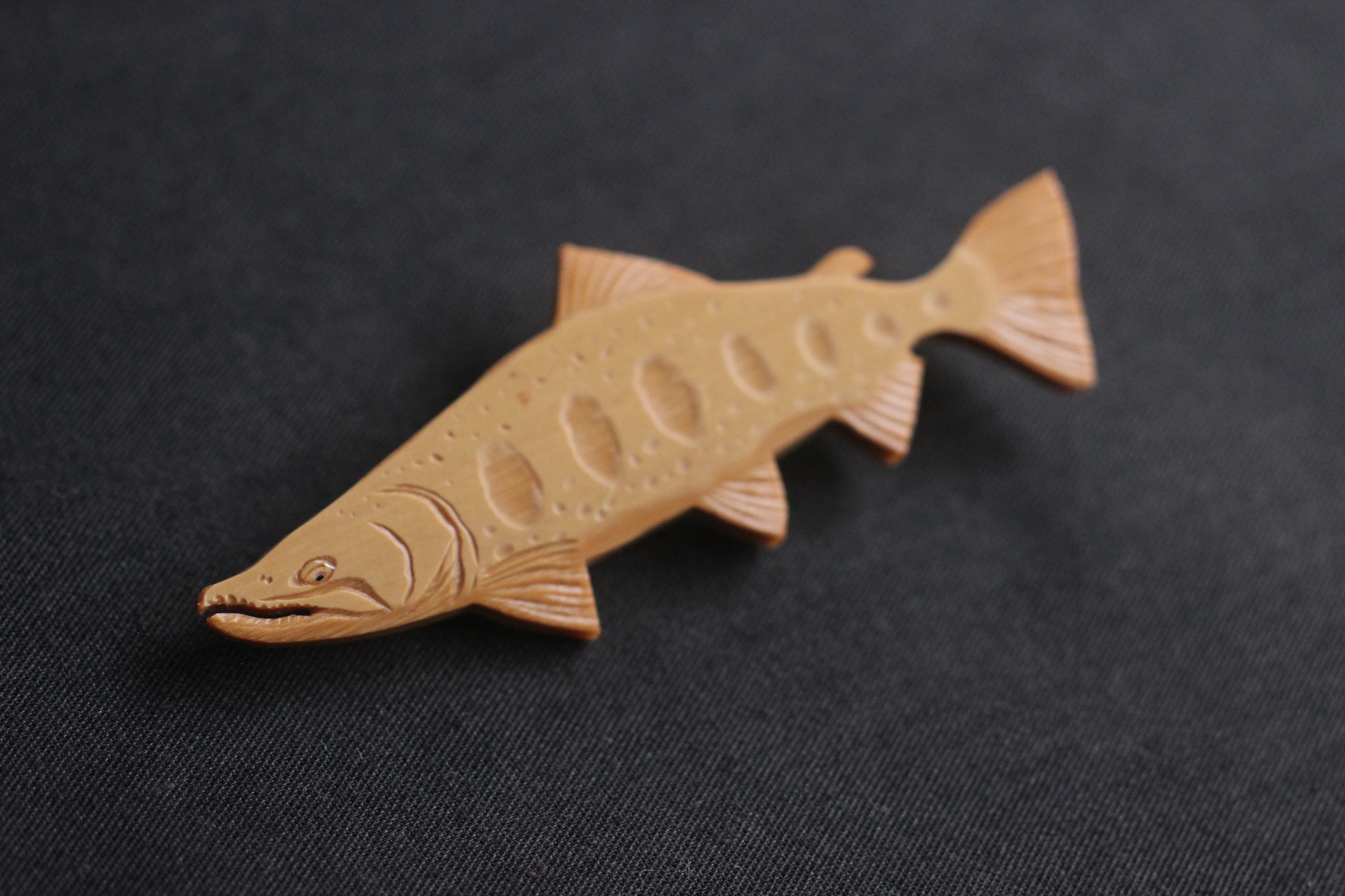 竹の表面の模様を活かすとともに、顔や鰭、パーマークを彫刻してリアルさをプラス。